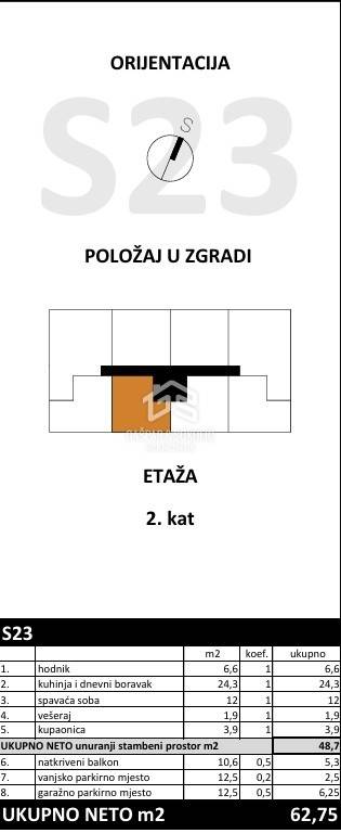 U sklopu projekta Bregana 2 prodaje se stan S23 u kvalitetnoj novogradnji na atraktivnoj lokaciji u Bregani. Stan se nalazi na drugom katu stambene zgrade s liftom te ima neto površinu 48,7 m², dok ukupna obračunska površina iznosi 62,75 m².