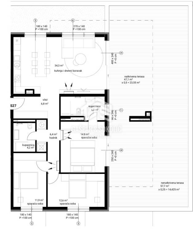 Stan se sastoji od ulaznog prostora, kuhinje s dnevnim boravkom, hodnika, dvije kupaonice i tri spavaće sobe. Dodatnu vrijednost daje natkrivena terasa površine 47,1 m² (obračunski 23,55 m²), i nenatkrivena terasa 57,7 m² (obračunski 14,42 m²) idealno za boravak na otvorenom.