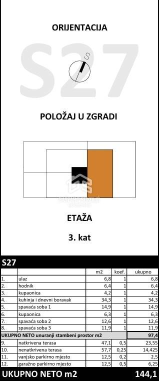 U sklopu projekta Bregana 2 prodaje se stan S27 u kvalitetnoj novogradnji na atraktivnoj lokaciji u Bregani. Stan se nalazi na trećem katu stambene zgrade s liftom te ima neto površinu 97,4 m², dok ukupna obračunska površina iznosi 144,,1 m².