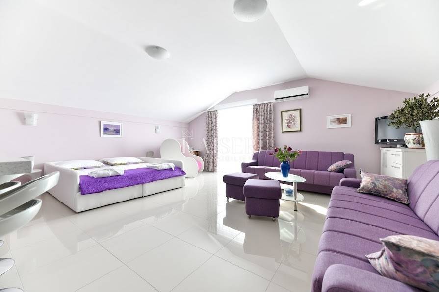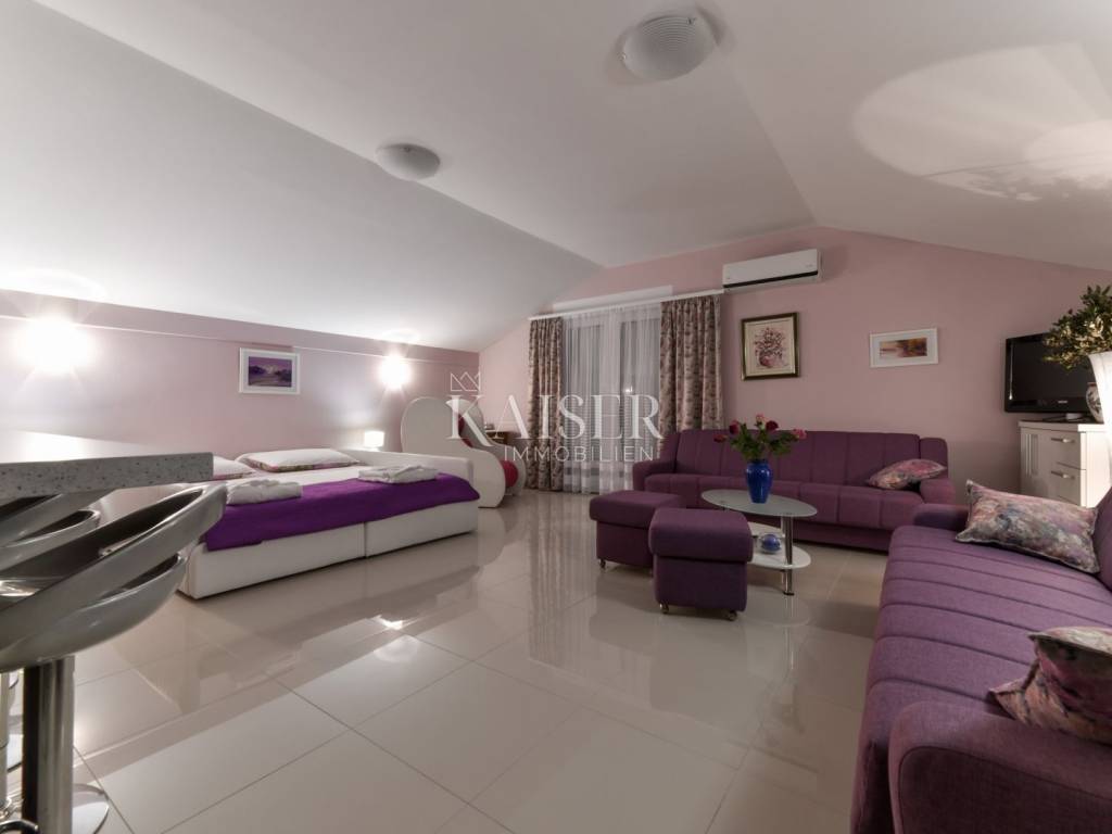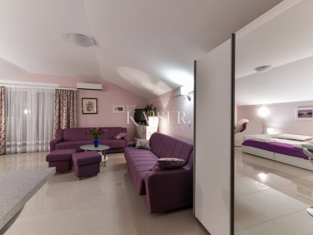 Potkrovlje je uređeno kao prostrani studio apartman površine oko 50 m2, savršen za goste ili kao samostalna jedinica za turistički najam, uz dodatni tavanski prostor uređen kao spremište.