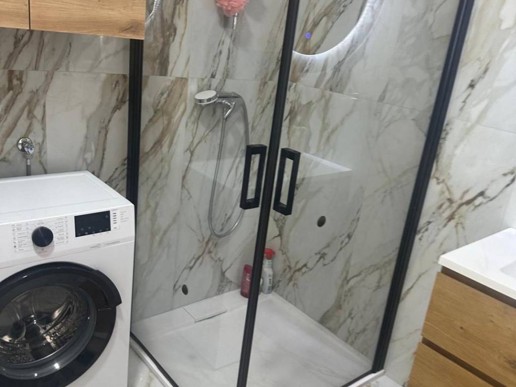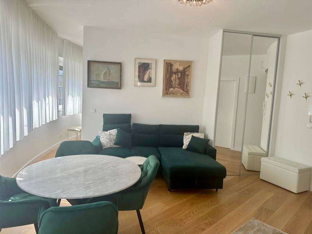 Sastoji se od: • Dnevnog boravka i spavaćeg dijela • Funkcionalne kuhinje s perilicom posuđa, pećnicom i frižiderom • Uređenog dnevnog prostora s kaučem, stolom, TV-om i ugradbenim ormarom • Kupaonice s tuš kabinom i perilicom rublja