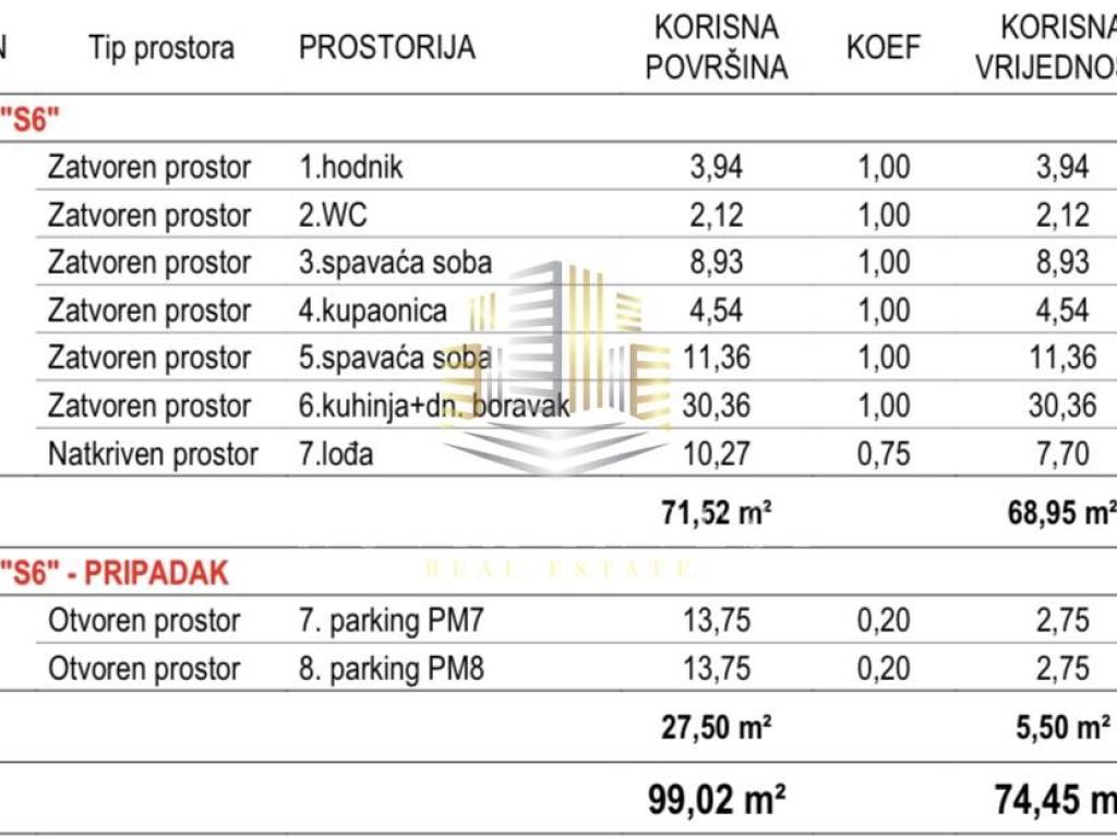Stan se prostire na neto površini od 74,45 m², dok ukupna bruto površina iznosi 99,02 m², čime je osigurana funkcionalna organizacija prostora pogodna za obitelji, parove ili pojedince koji traže prostran i udoban dom.