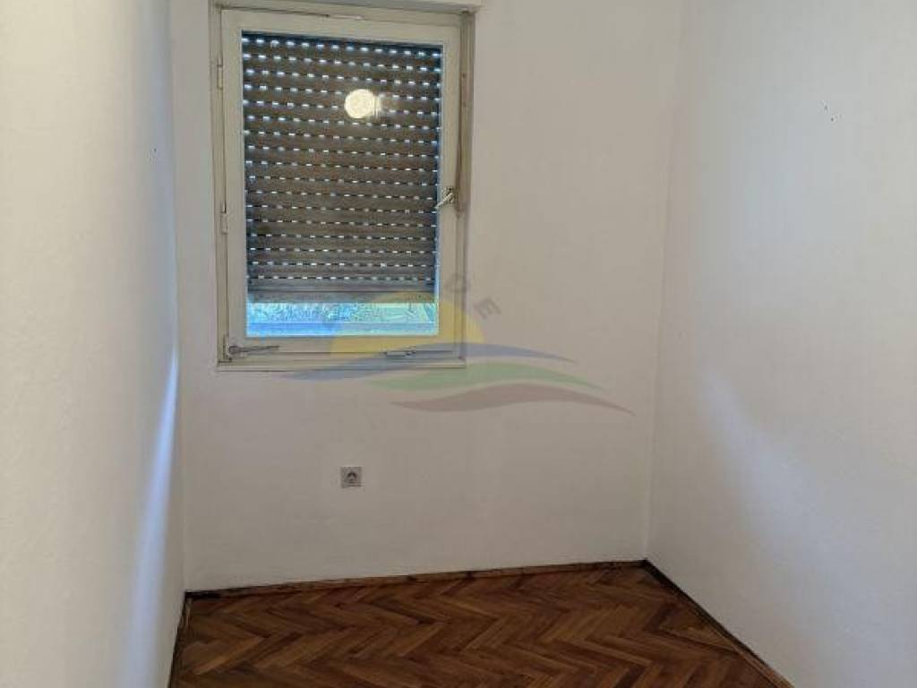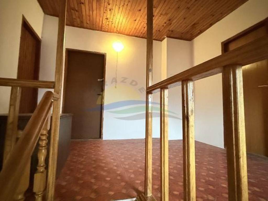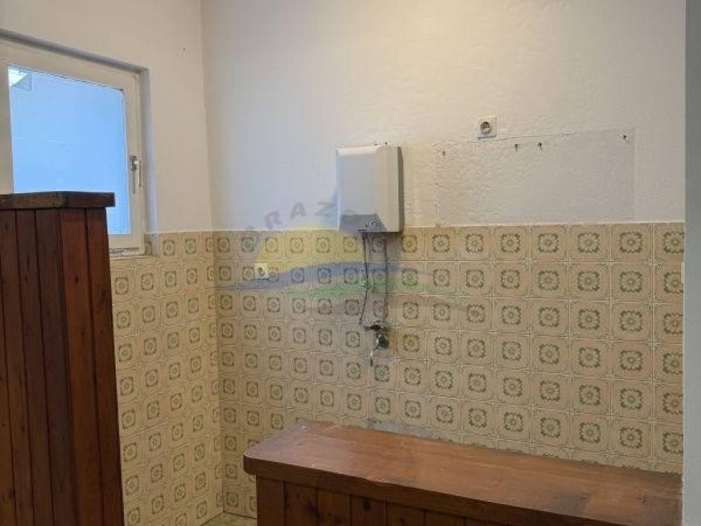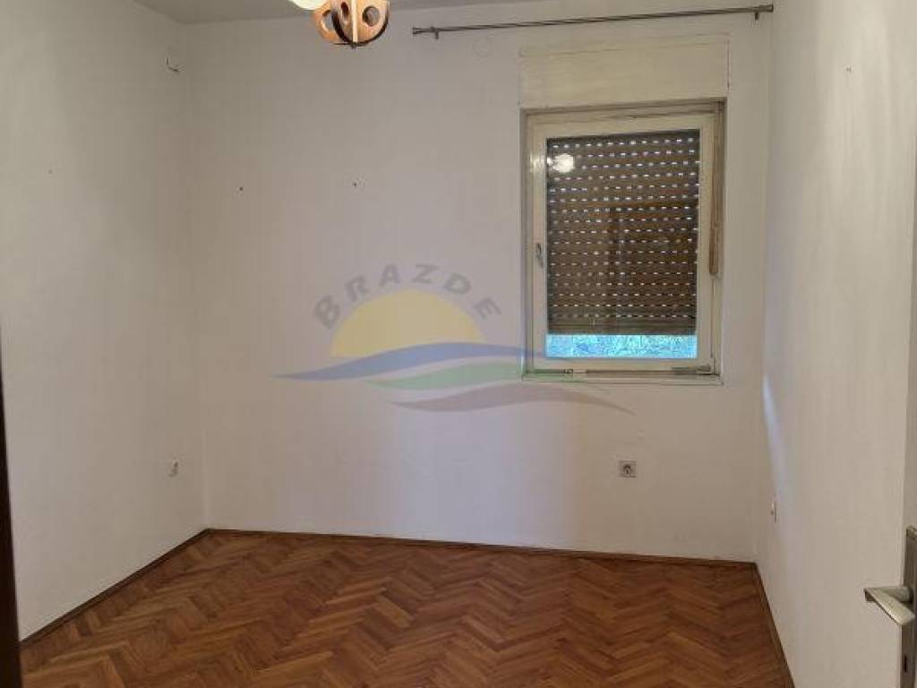 Prizemlje (60m2) se sastoji od dnevnog boravak sa izdvojenom kuhinjom iza šanka iz kojeg je i moguć sporedni (stražnji izlaz) iz kuće, dvije spavaće sobe, kupaone sa kadom i wc-om, ostave i ulaznog hodnika sa drvenim stepeništen na kat.