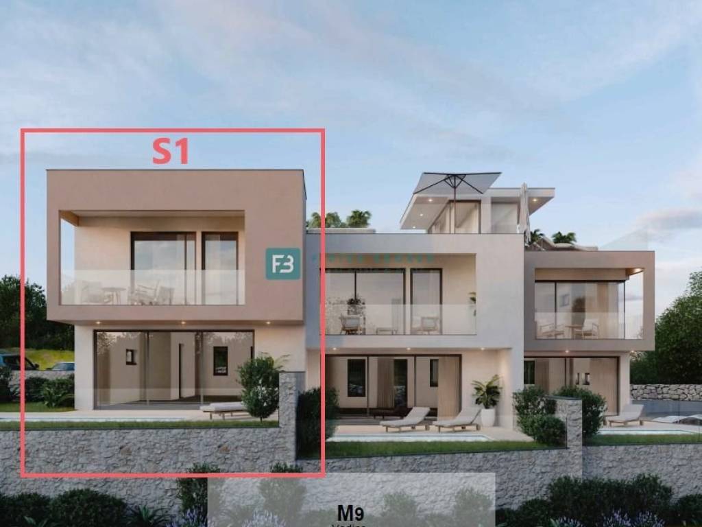 Troetažni stan S3 funkcionalnog i prostranog rasporeda ima 204,04 m2 ukupne neto korisne površine (171,67 m2 stambene površine + bazen površine 15 m2 + dvorište površine 87,31 m2 + parking površine 34,56 m2). Proteže se na tri etaže: prizemlje + 1. kat + krovna terasa. U prizemlju površine 78,17 m2 nalazi se natkriveni ulaz, ulazni prostor, spremište, spavaća soba, kupaonica, kuhinja s blagovaonicom i dnevni boravak s izlazom na natkrivenu terasu površine 12,14 m2. Velika klizna stijena pruža lijepi pogled na vrt i grijani bazen površine 15 m2 sa sunčalištem. Unutarnje stubište vodi na kat površine 71,04 m2 gdje se nalazi hodnik, glavna spavaća soba s vlastitom kupaonicom i natkrivenom terasom površine 10,67 m2, spavaća soba s nenatkrivenom terasom površine 4,60 m2 i kupaonica. Stepenice vode do krovne terase površine 22,46 m2 s koje se pruža panoramski pogled na more i okolicu. Opremljena je priključcima za vodu i struju, koja se može preurediti u opuštajuću oazu s jacuzzijem, idealnu za uživanje na otvorenom. Stanu pripadaju dva parking mjesta. Cijena iznosi 825.000 € (PDV uključen - kupac je oslobođen plaćanja 3% poreza na promet nekretninama).