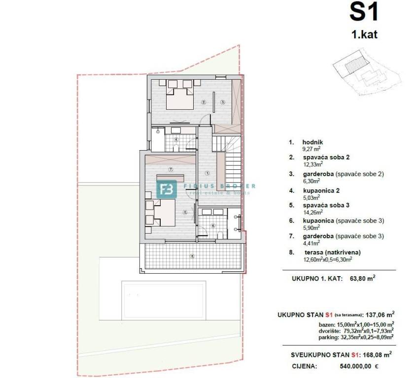 Dvoetažni stan S1 funkcionalnog i prostranog rasporeda ima 168,08 m2 ukupne neto korisne površine (137,06 m2 stambene površine + bazen površine 15 m2 + dvorište površine 79,32 m2 + parking površine 32,35 m2). Proteže se na dvije etaže: prizemlje + 1. kat. U prizemlju površine 73,26 m2 nalazi se natkriveni ulaz, ulazni prostor, spavaća soba, kupaonica, kuhinja s blagovaonicom i dnevni boravak s izlazom na natkrivenu terasu površine 14,20 m2. Velika klizna stijena pruža lijepi pogled na vrt i grijani bazen površine 15 m2 sa sunčalištem. Unutarnje stubište vodi na kat površine 63,80 m2 gdje se nalazi hodnik, glavna spavaća soba s vlastitom kupaonicom, garderobom i natkrivenom terasom površine 12,60 m2, spavaća soba s garderobom i kupaonica. Stanu pripada 1 parking mjesto.