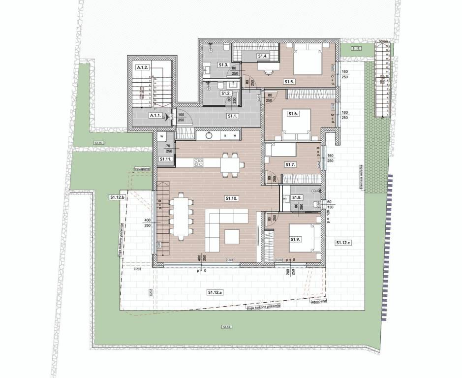 - Stan S1 - neto obračunska površina 230 m2 (4 spavaće sobe + 3 kupaonice + 3 terase + vrt 240 m2 + garažno parkirno mjesto + vanjsko parkirno mjesto)