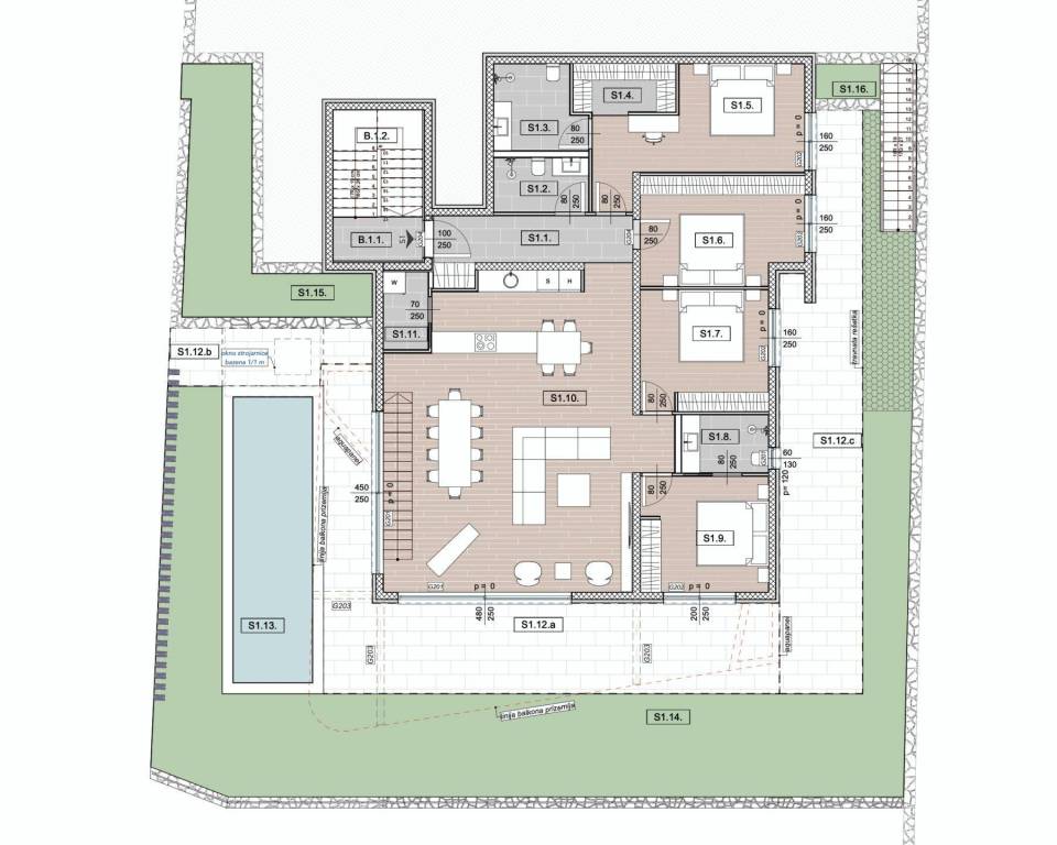 - Stan S1 - neto obračunska površina 275 m2 (4 spavaće sobe + 3 kupaonice + 3 terase + vrt 260 m2 + bazen + garažno parkirno mjesto + vanjsko parkirno mjesto)