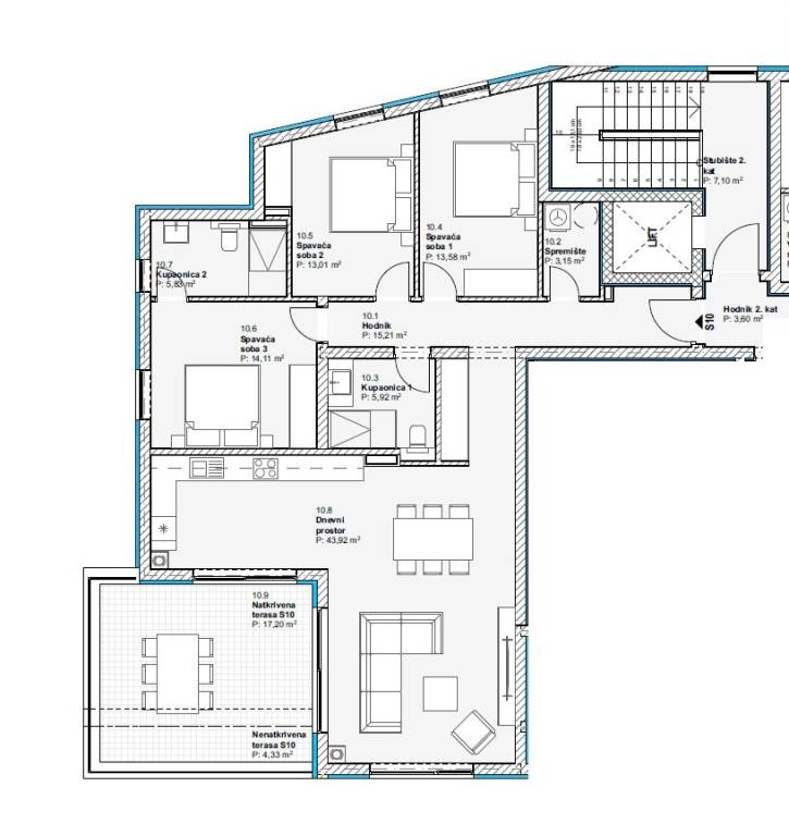Stan S10 na II. katu ukupne površine 125,50 m2 sastoji se od: ulaza, hodnika, vešeraja, kupaonice 1, dvije spavaće sobe, spavaće sobe s vlastitom kupaonicom 2, kuhinje s blagovaonicom i dnevnog boravka te natkrivene terase površine 17,20 m2. Stanu pripada ostava u podrumu i jedno parkirno mjesto.