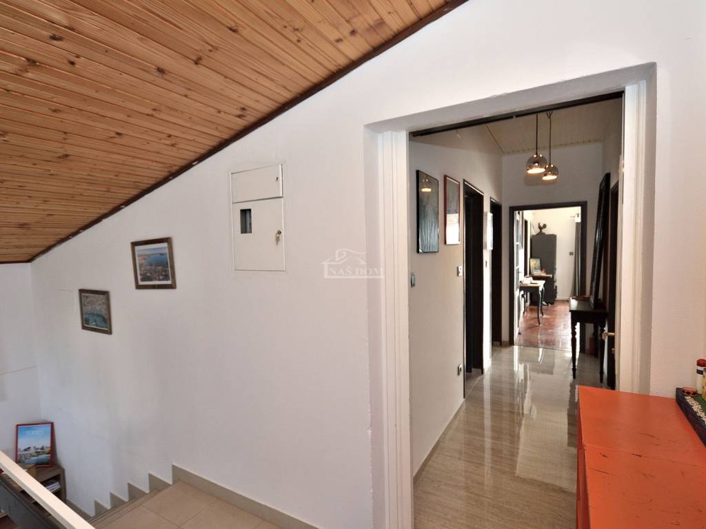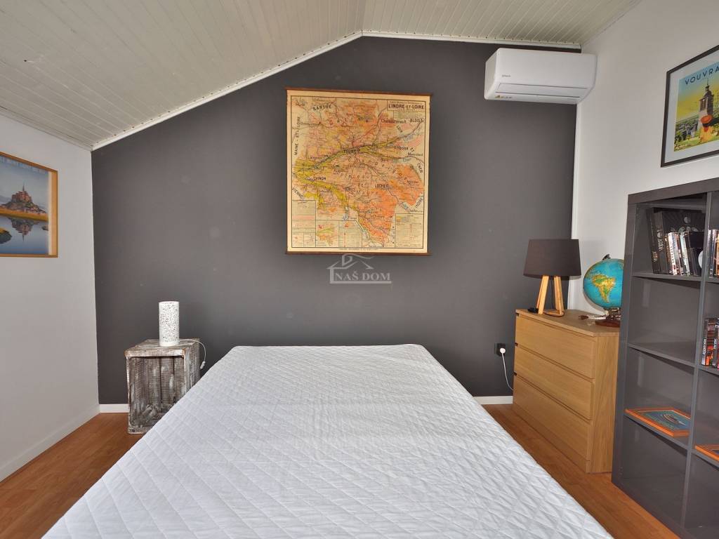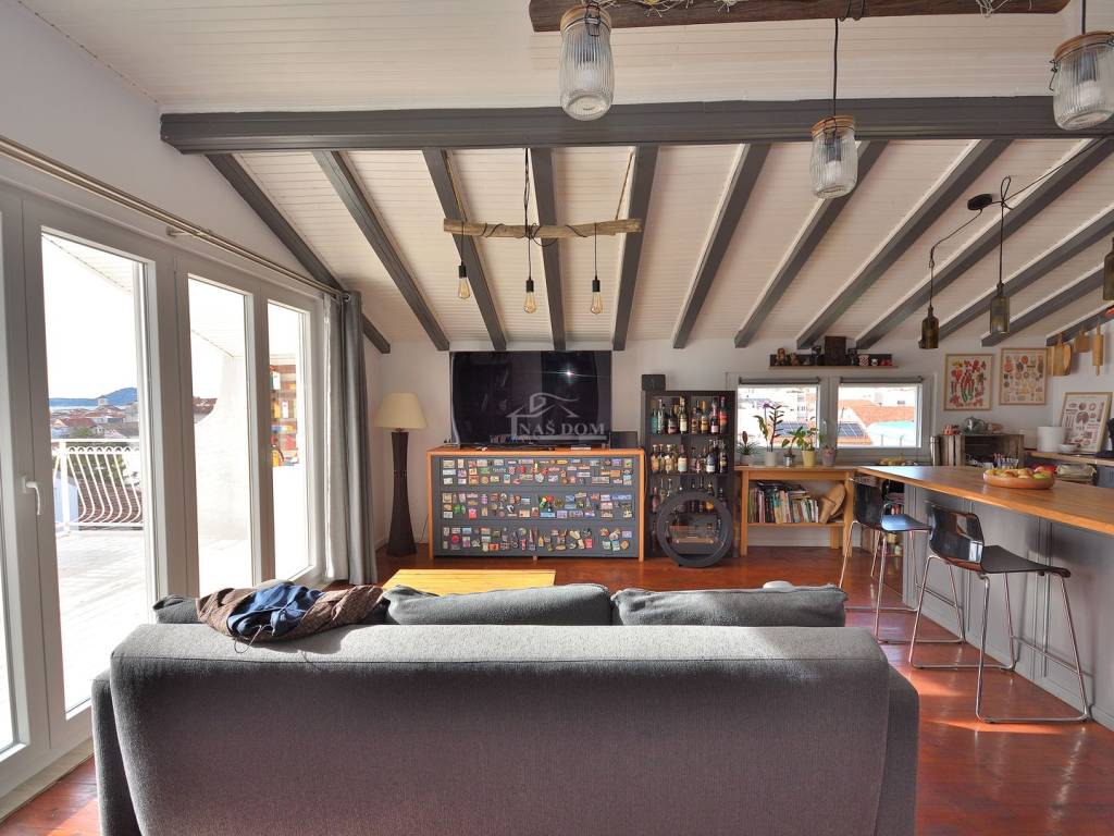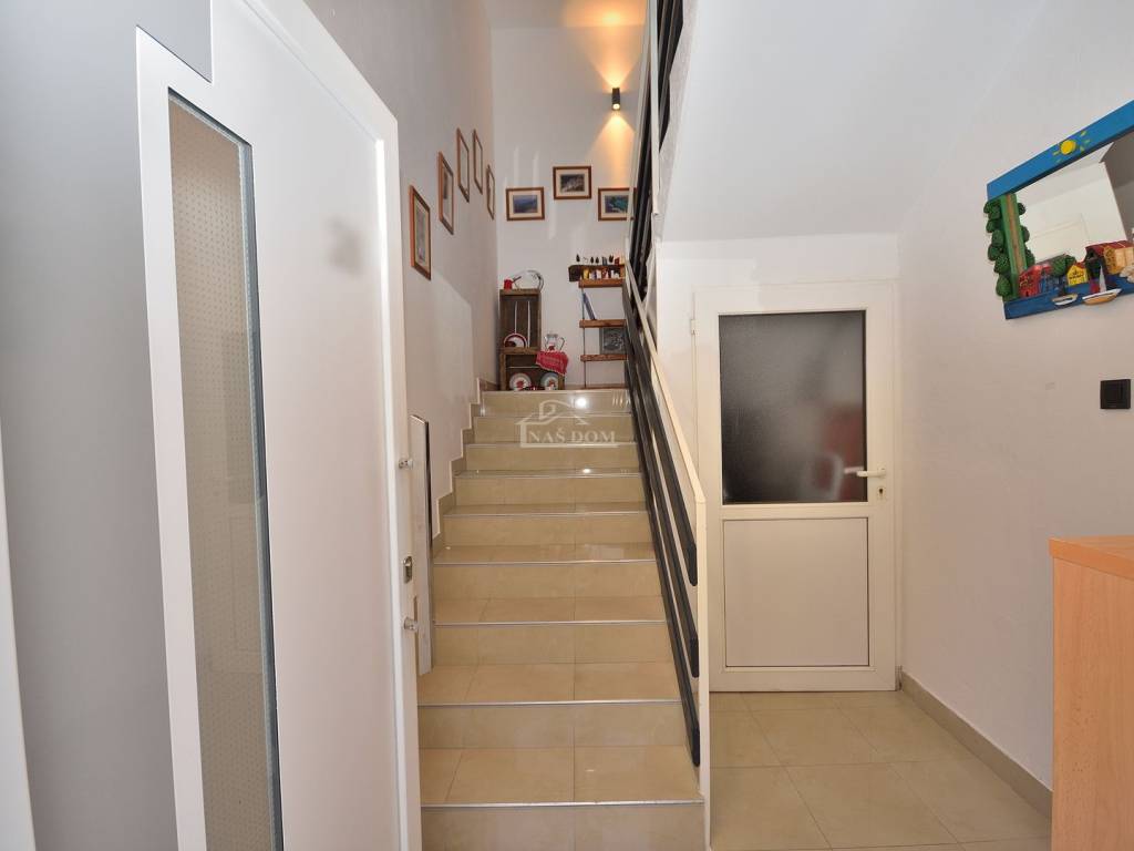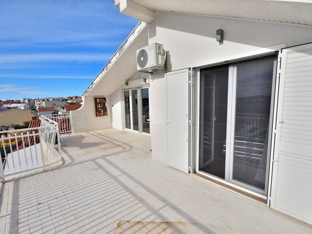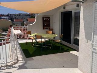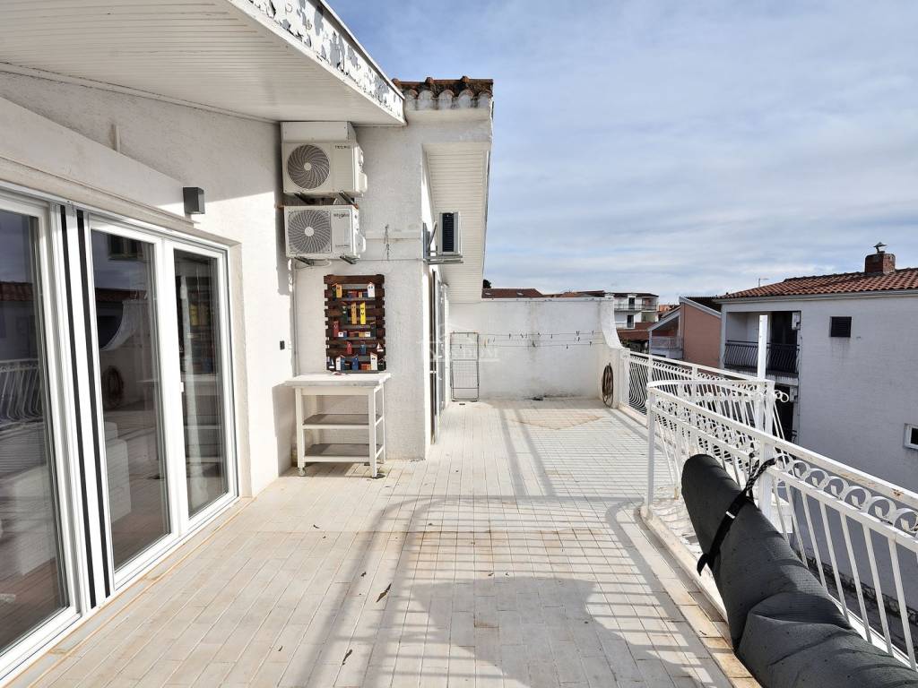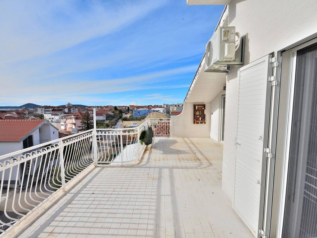 Vodice - prodaje se komforan i lijepo namješten stan na drugom katu manje stambene zgrade na mirnoj lokaciji. Stan površine 116,83m2 ima privatan ulaz i stubište koje pripada isključivo stanu te sadrži hodnik, kupaonicu, dvije komforne spavaće sobe od kojih jedna ima izlaz na terasu, 1 manju spavaću sobu, kuhinju s blagovaonicom i dnevni boravak open space rasporeda s izlazom na terasu površine 29.40m2 s koje se pruža predivan pogled na more i grad Vodice. Stan je klimatiziran, klima uređaji grijanje /hlađenje se nalaze u spavaćim sobama i dnevnom boravku, te je kompletno namješten. Stanu pripada i ograđeno dvorište površine 79m2 gdje se nalaze dodatni sadržaji poput vanjskog WC-a, ostave, ljetne kuhinje i prostora za druženje te jedno prostrano parkirno mjesto.