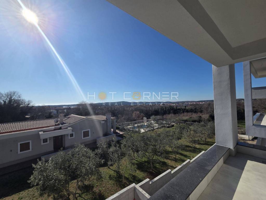 Raspored stana uključuje: – tri elegantne spavaće sobe – tri kupaonice + gostinjski WC – prostrani dnevni boravak s kuhinjom i blagovaonicom – natkrivenu terasu s panoramskim pogledom