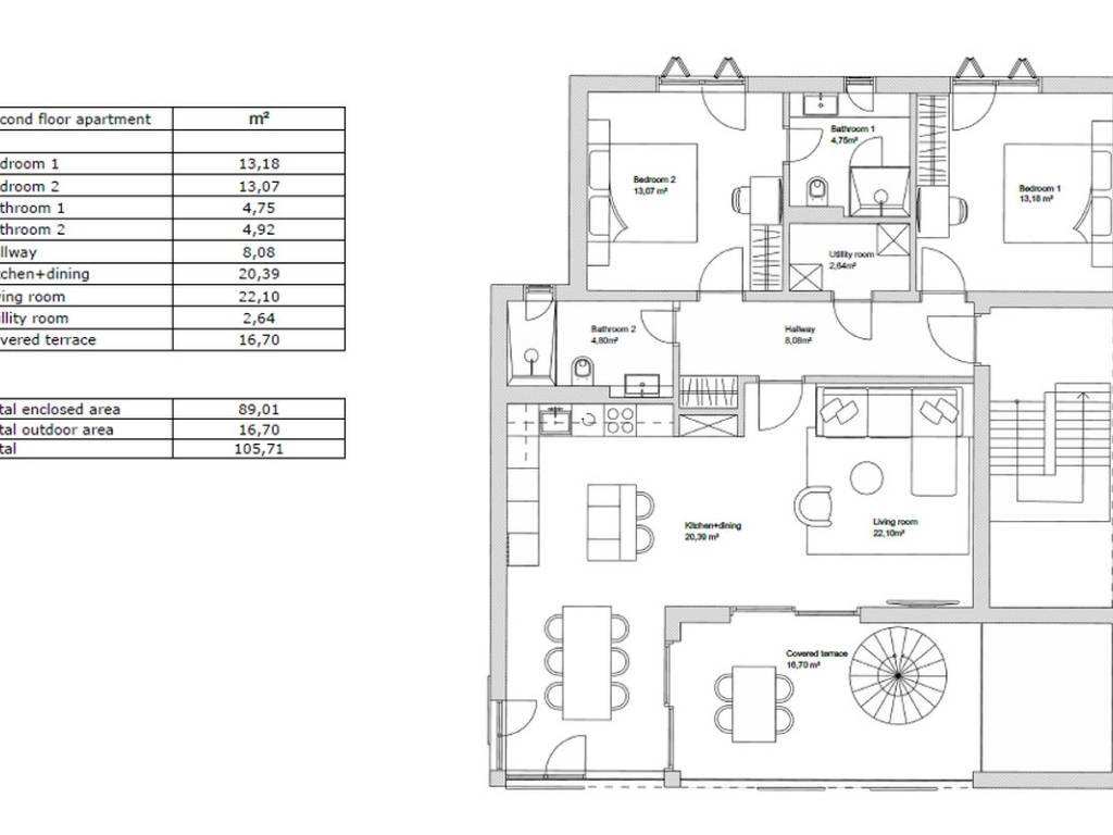 Stan se sastoji od dvije spavaće sobe od kojih je jedna en suite. Osim toga sadrži hodnik, spremu, još jedno kupatilo te prostoriju otvorenog koncepta koja objedinjuje kuhinju, dnevni boravak i blagovaonicu. Iz dnevnog prostora izlazi se na natkrivenu terasu od gotovo 17m2 s koje se spiralnim stubištem izlazi na prostranu krovnu terasu površine 65m2.