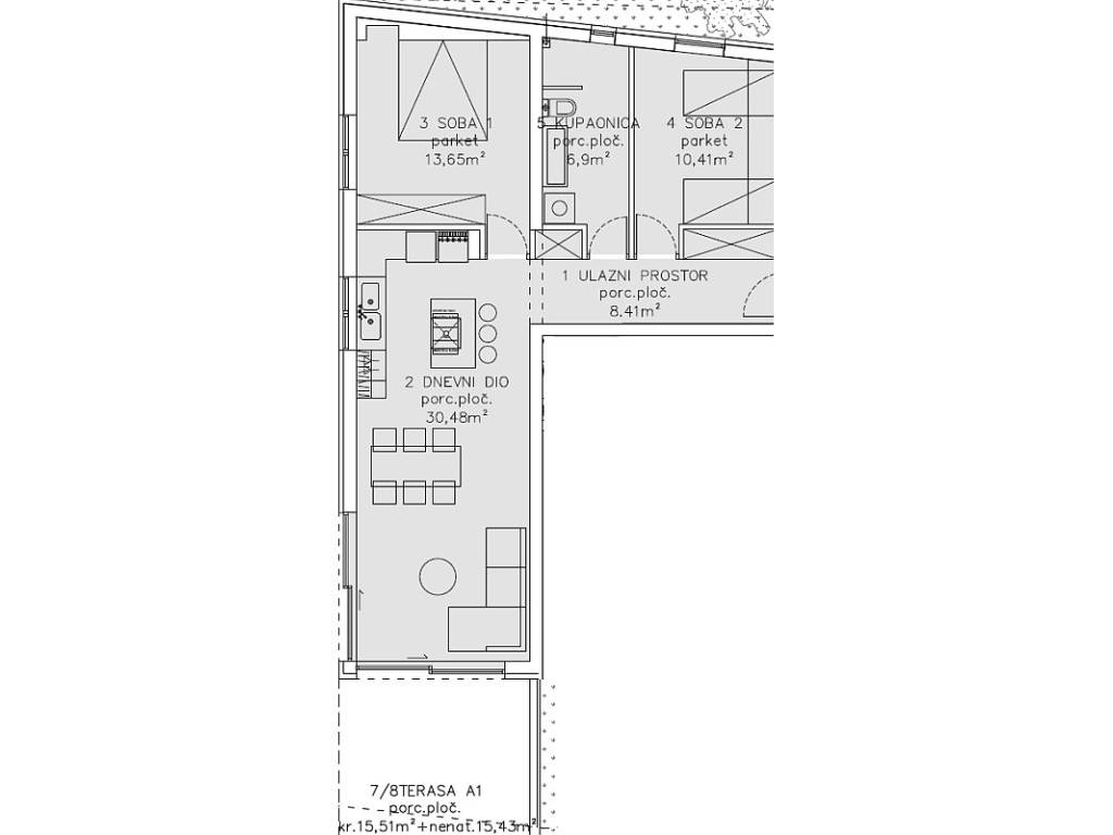 Stan sadrži ukupnu stambenu površinu od gotovo 72m2 te još oko 12m2 vanjskog prostora kroz natkrivenu i nenatkrivenu terasu.