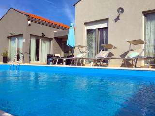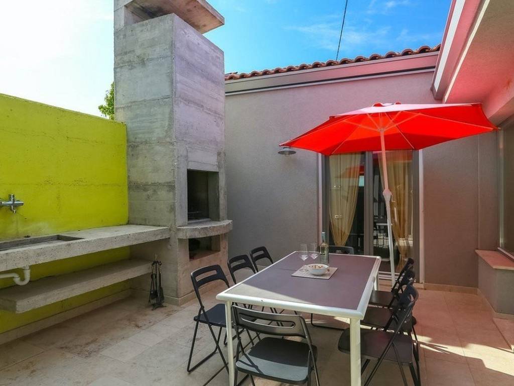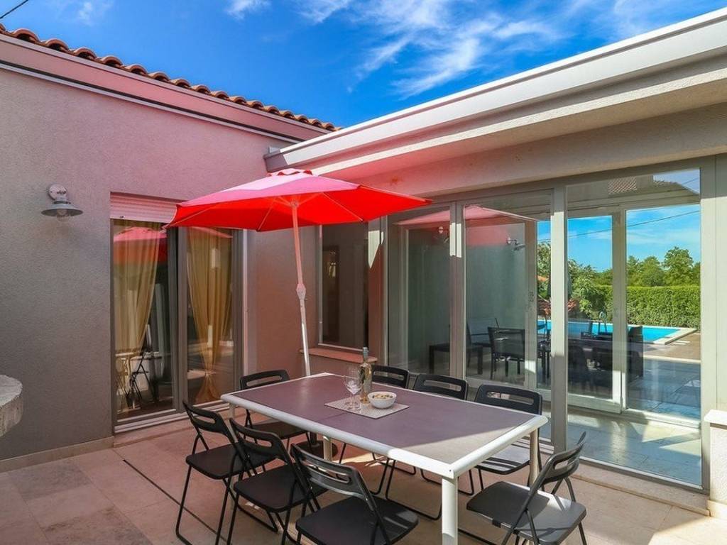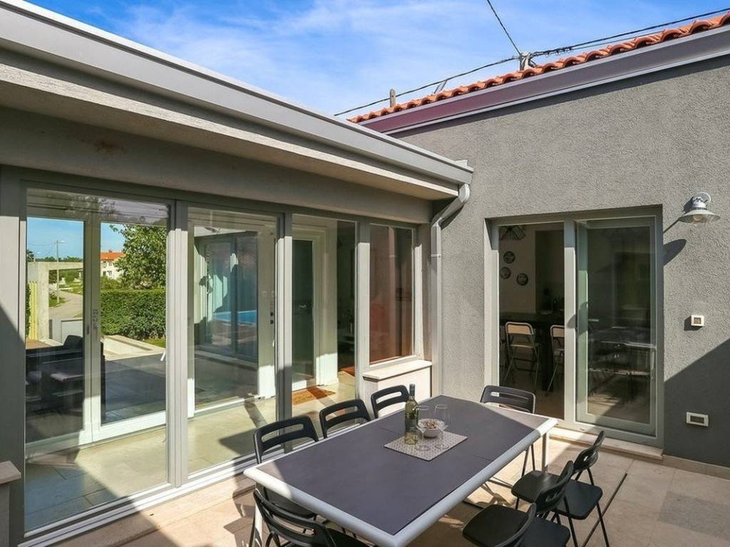 U prednjem dijelu okućnice nalazi se bazen sa sunčalištem, okružen visokim zelenilom koje pruža osjećaj privatnosti i mira. Osim toga, atrij s kaminom i velikim stolom idealan je za druženja s obitelji i prijateljima tijekom cijele godine.