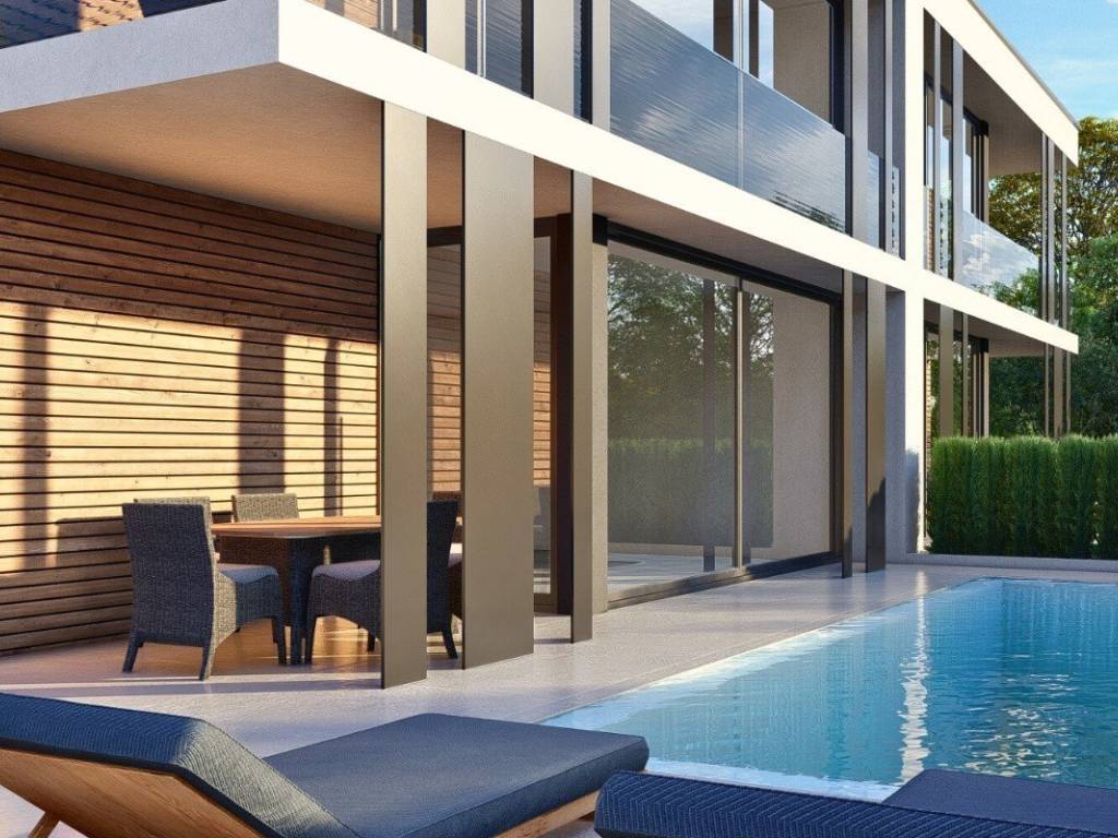 Na prodaju je prizemni stan unutar modernog stambenog kompleksa u mirnom dijelu Istre, udaljen svega 800 metara od mora. Stan se prostire na približno 70 četvornih metara unutarnjeg prostora, a sastoji se od dvije spavaće sobe, dvije kupaonice te prostranog dnevnog boravka povezanog s kuhinjom i blagovaonicom u open space konceptu. Velike staklene stijene povezuju unutarnji prostor s natkrivenom terasom i privatnim dvorištem površine oko 150 četvornih metara, u kojem se nalazi bazen i prostor za uživanje na otvorenom.