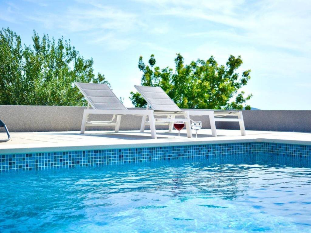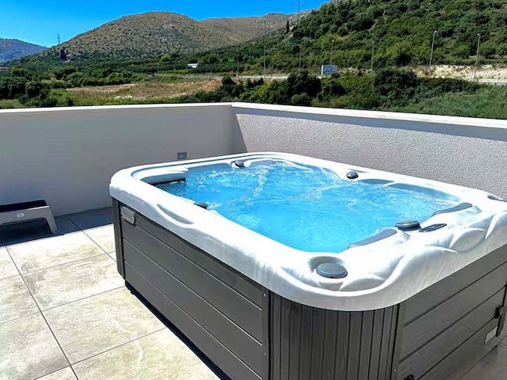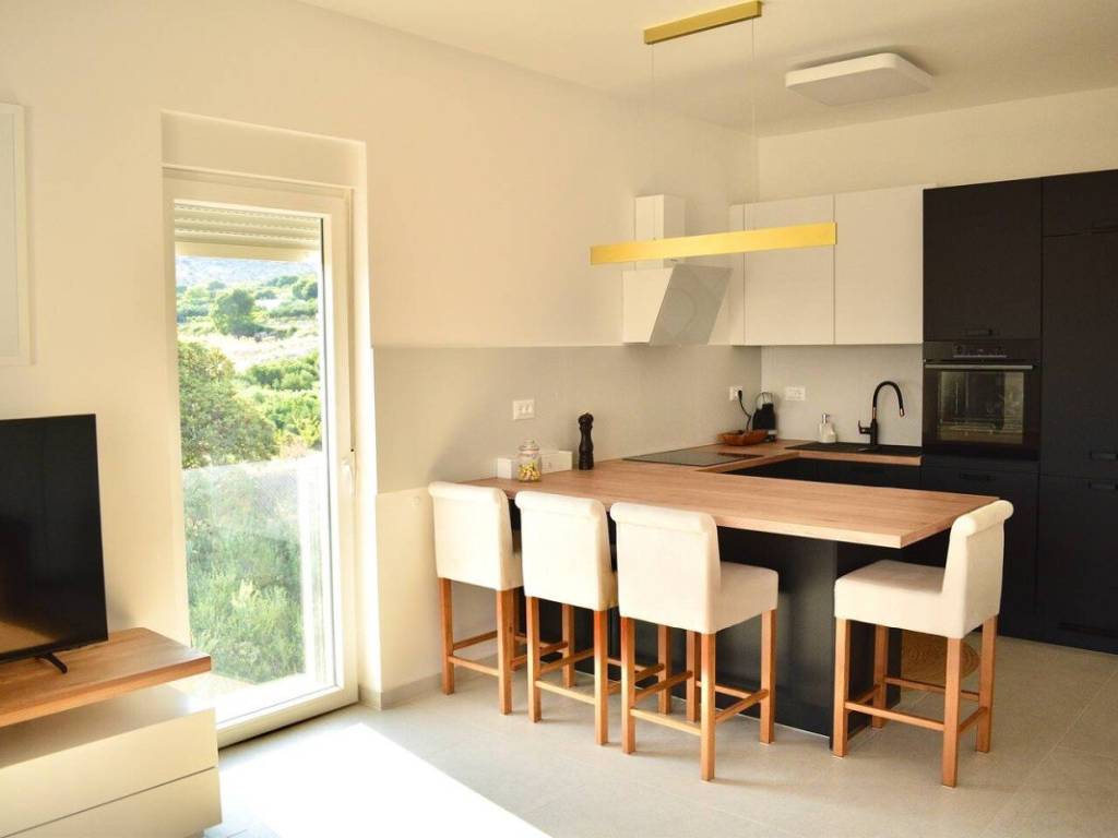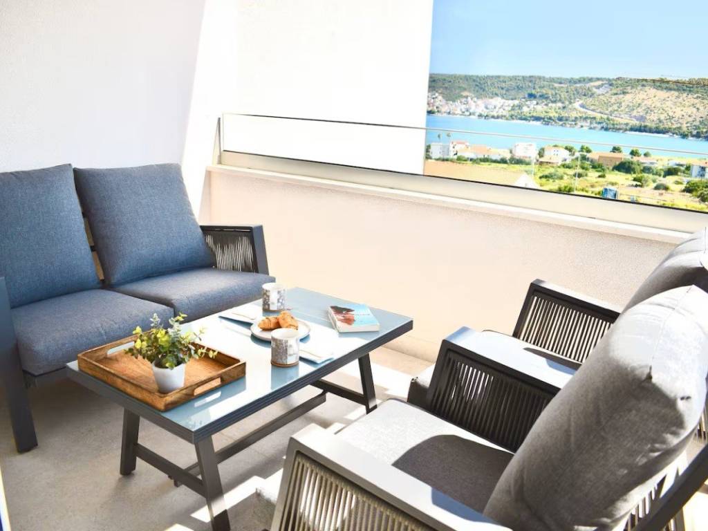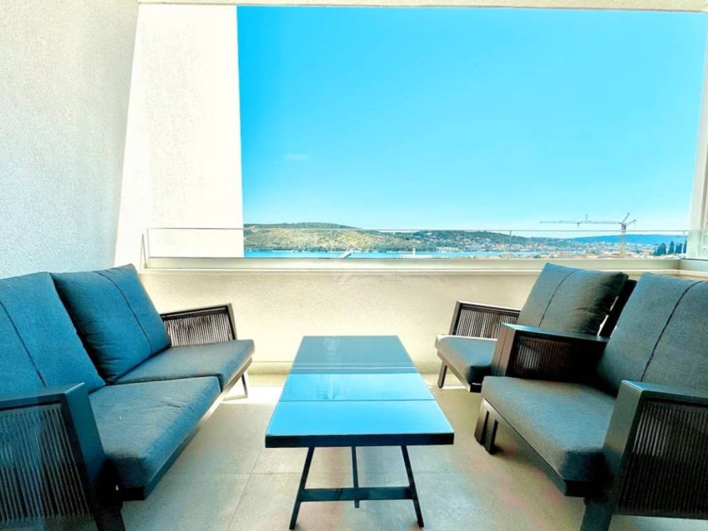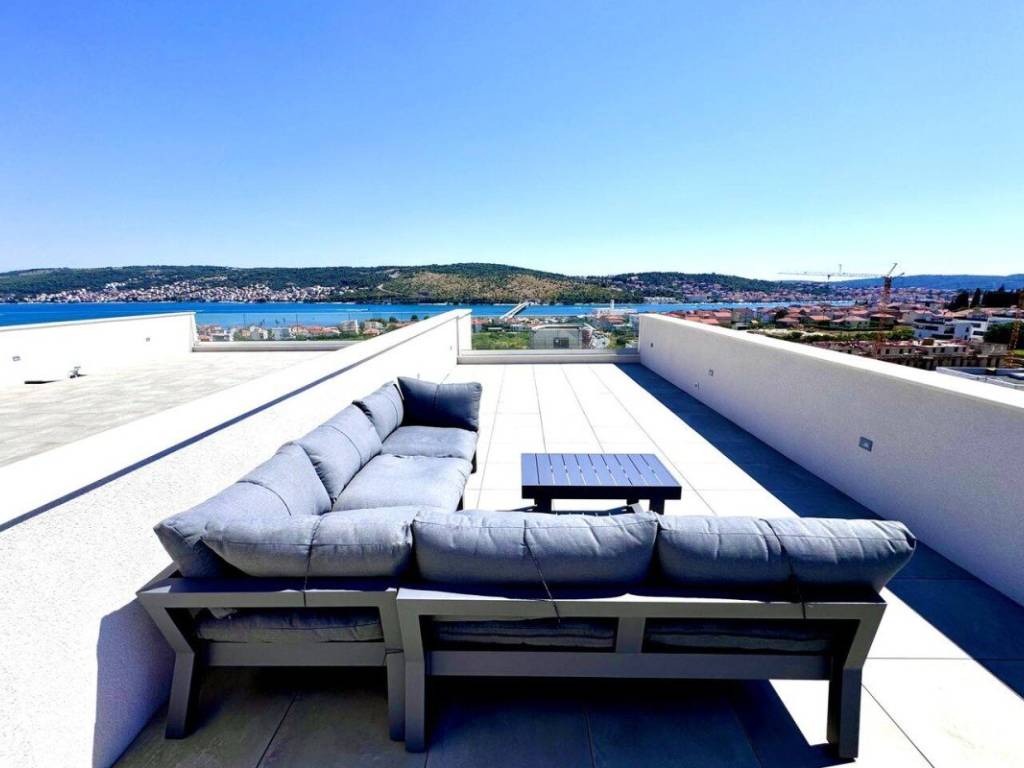 Stan ukupne površine 44,89 m sastoji se od funkcionalnog hodnika, moderne kupaonice, spavaće sobe te otvorenog koncepta kuhinje, blagovaonice i dnevnog boravka koji vodi na prostranu natkrivenu terasu površine 9,67 m. S terase se pruža očaravajući, otvoreni pogled na more i povijesni grad Trogir. Poseban adut ove nekretnine je privatna krovna terasa površine čak 57,21 m, opremljena lounge namještajem i masažnom kadom.