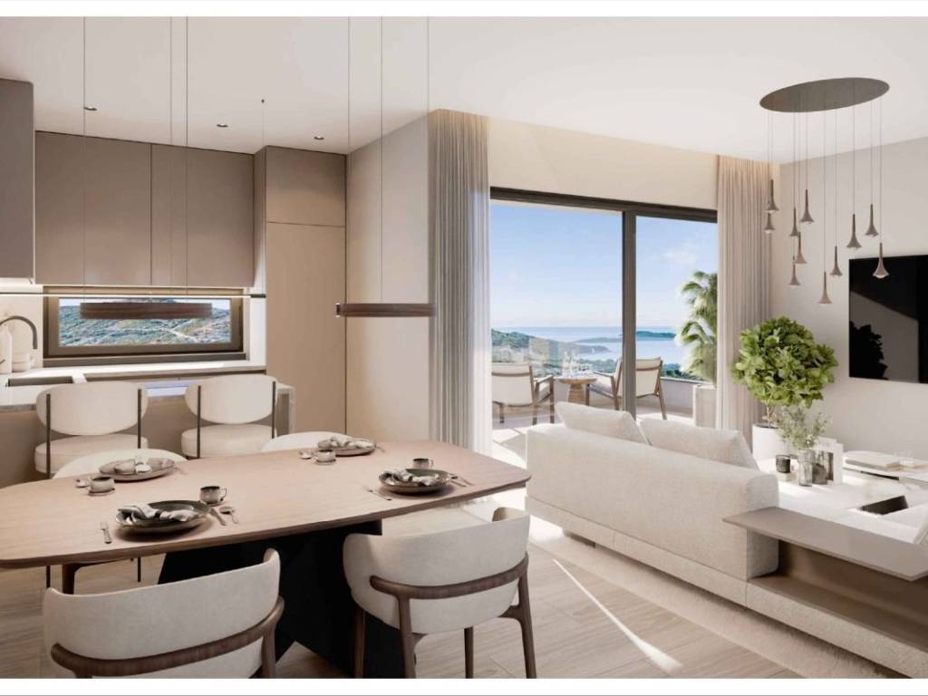 Unutrašnjost stana sastoji se od ulaznog hodnika, moderno opremljene kupaonice, dvije spavaće sobe, kuhinje te otvorenog koncepta dnevnog boravka s blagovaonicom. Iz dnevnog prostora omogućen je izlaz na lođu s koje se pruža pogled na more i grad.