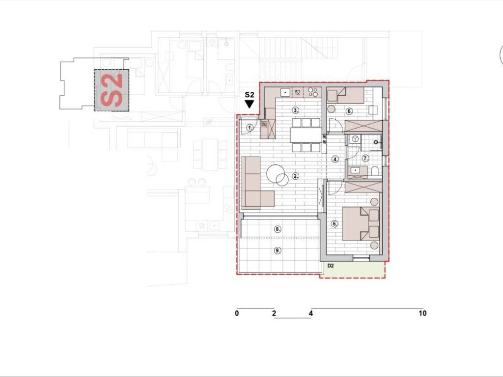 Unutrašnjost stana sastoji se od ulaznog hodnika, moderno opremljene kupaonice, dvije spavaće sobe, kuhinje te otvorenog koncepta dnevnog boravka s blagovaonicom. Iz dnevnog prostora omogućen je izlaz na terasu i dvorište.