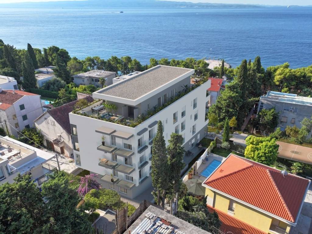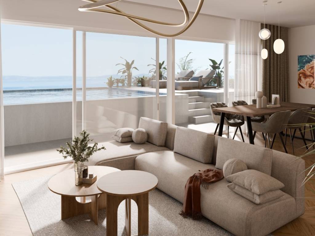 Penthouse se nalazi na nadgrađu moderne stambene zgrade s dizalom, a njegova najveća prednost je impresivna terasa s bazenom, koja okružuje cijeli stan i nudi nesmetan užitak u spektakularnom pogledu na more i grad.