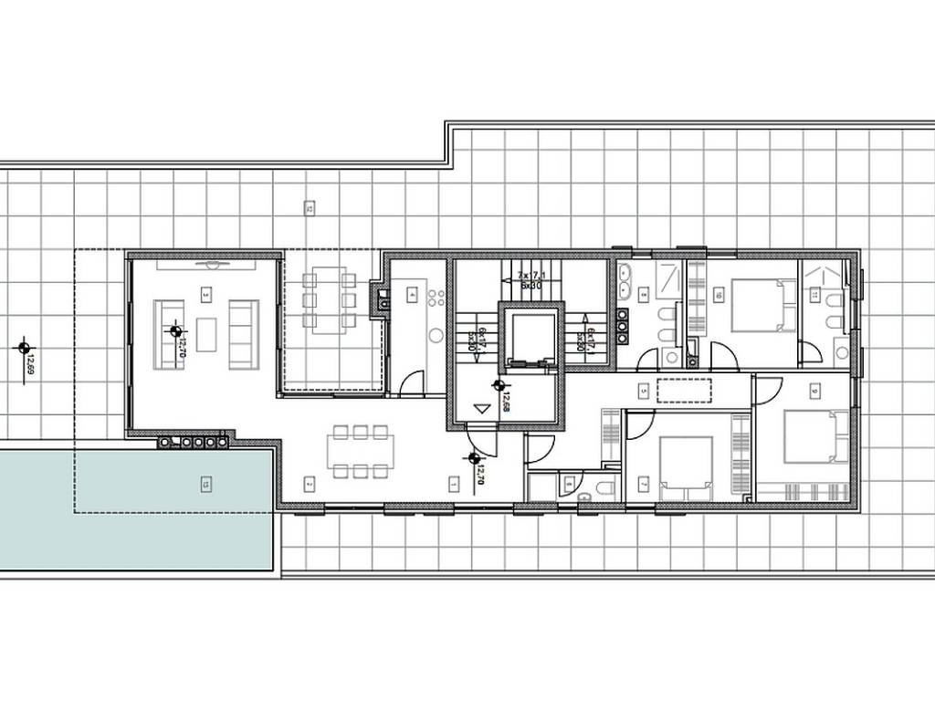 Stambena površina od 106,73 m pažljivo je osmišljena kako bi osigurala maksimalnu udobnost i funkcionalnost. Stan se sastoji od ulaznog dijela, hodnika, toaleta, tri prostrane spavaće sobe, dvije kupaonice te sofisticiranog dnevnog boravka, skladno povezanog s blagovaonicom i kuhinjom. Iz gotovo svake prostorije omogućava se izlaz na impozantnu terasu površine 177,16 m, koja pruža savršeno mjesto za opuštanje. Terasa uključuje privatni bazen od 31,37 m, sunčalište i obilje prostora za kreiranje sadržaja prema vlastitim željama.