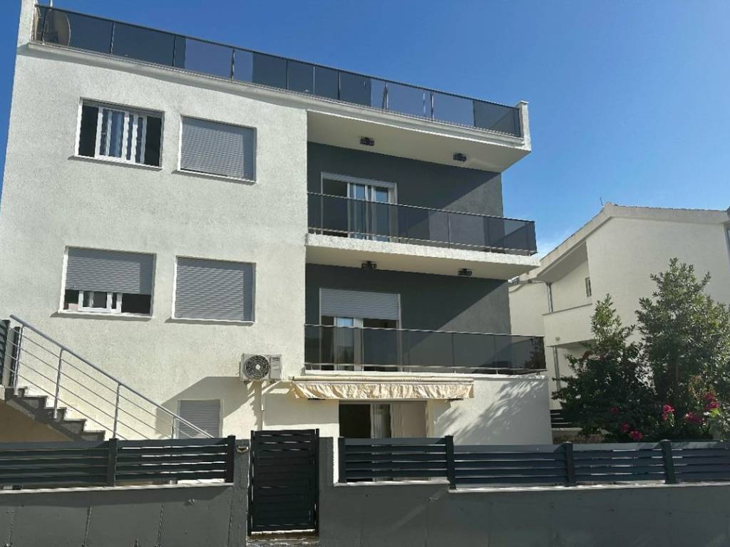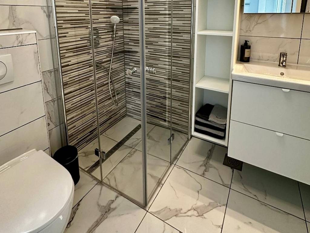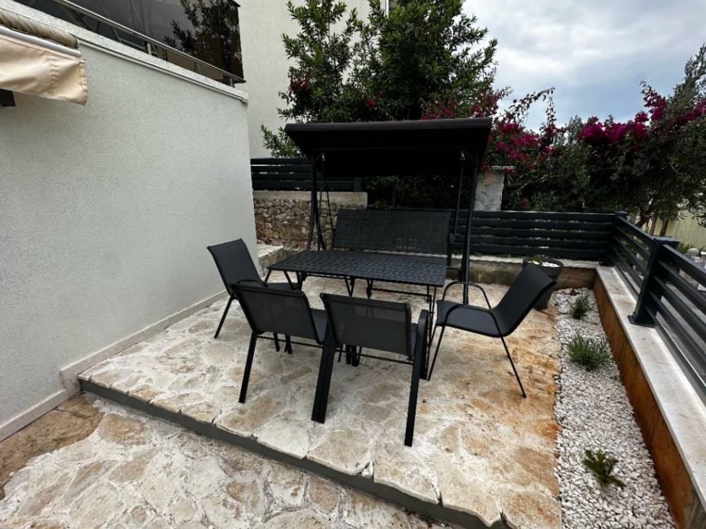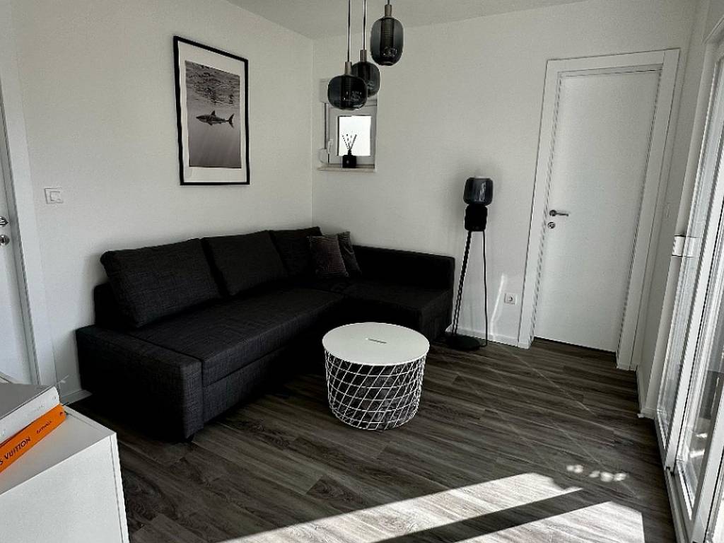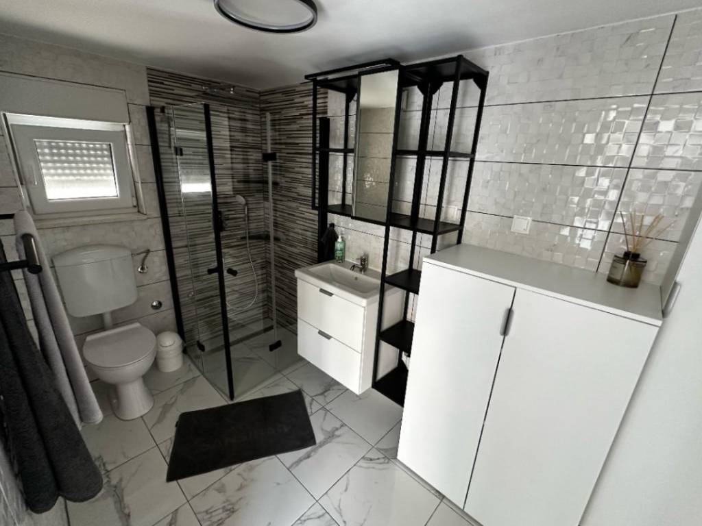 Prizemlje kuće nudi iznimno funkcionalan raspored. Svijetao i prostran dnevni boravak povezan je s modernom kuhinjom i blagovaonicom, stvarajući ugodan ambijent za obiteljska druženja i opuštanje. Na ovoj etaži nalazi se i elegantna spavaća soba, ukusno uređena kupaonica te prostrana vrtna terasa okružena mediteranskim biljem, savršena za jutarnju kavu ili večernje uživanje uz lagani povjetarac s mora.