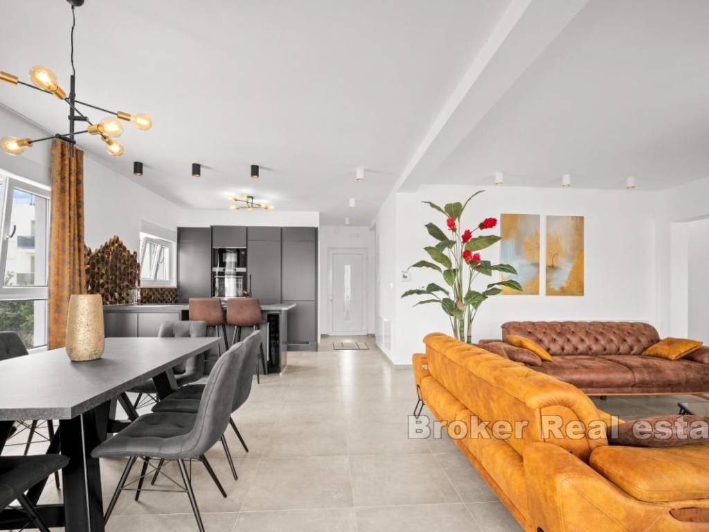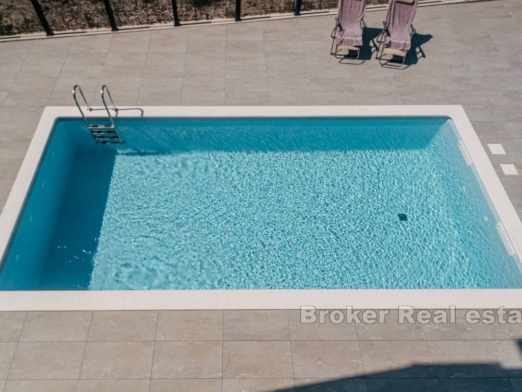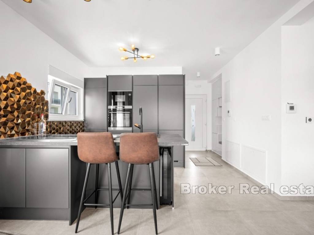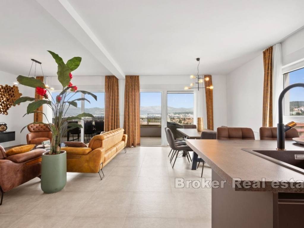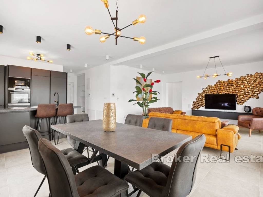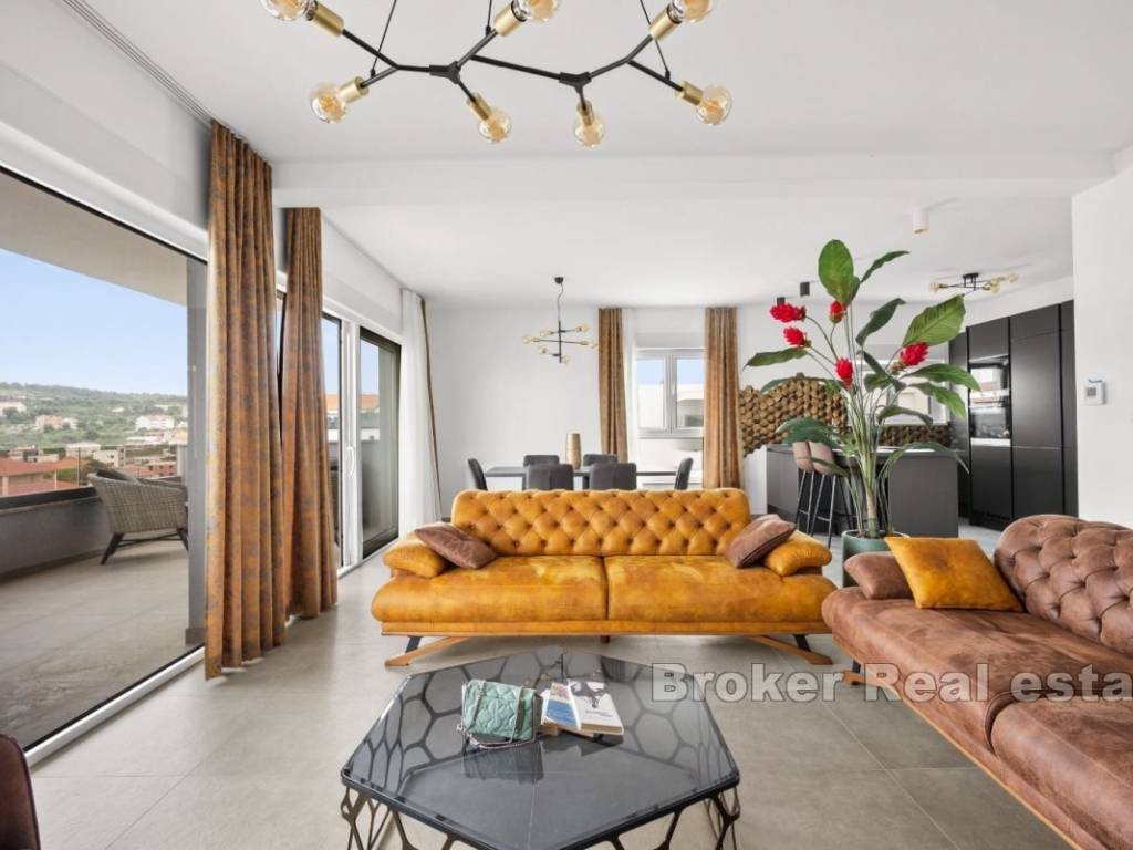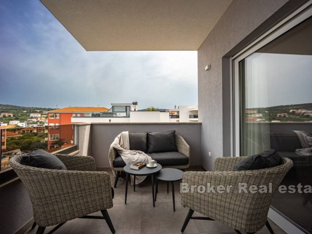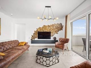 Luksuzni penthouse s prekrasnim pogledom na more i bazenom, smješten u mirnom mjestu na slikovitom otoku Čiovu, nedaleko od šarmantnog grada Trogira udaljen od mora svega 250 m. Ovaj izvrstan penthouse ima zavidnu lokaciju u neposrednoj blizini plaže te nudi neusporediv pogled na more i uživanje u prekrasnoj mediteranskoj klimi. Smješten unutar suvremenog stambenog objekta, ovaj moderan stan utjelovljuje sofisticiranost i udobnost. Prostire se na dvije etaže i ima veliki stambeni prostor od 109 m2 s atraktivnim terasama i balkonima ukupne površine 30 m2 te krovnom terasom površine 119 m2 te zajedničkim bazenom.