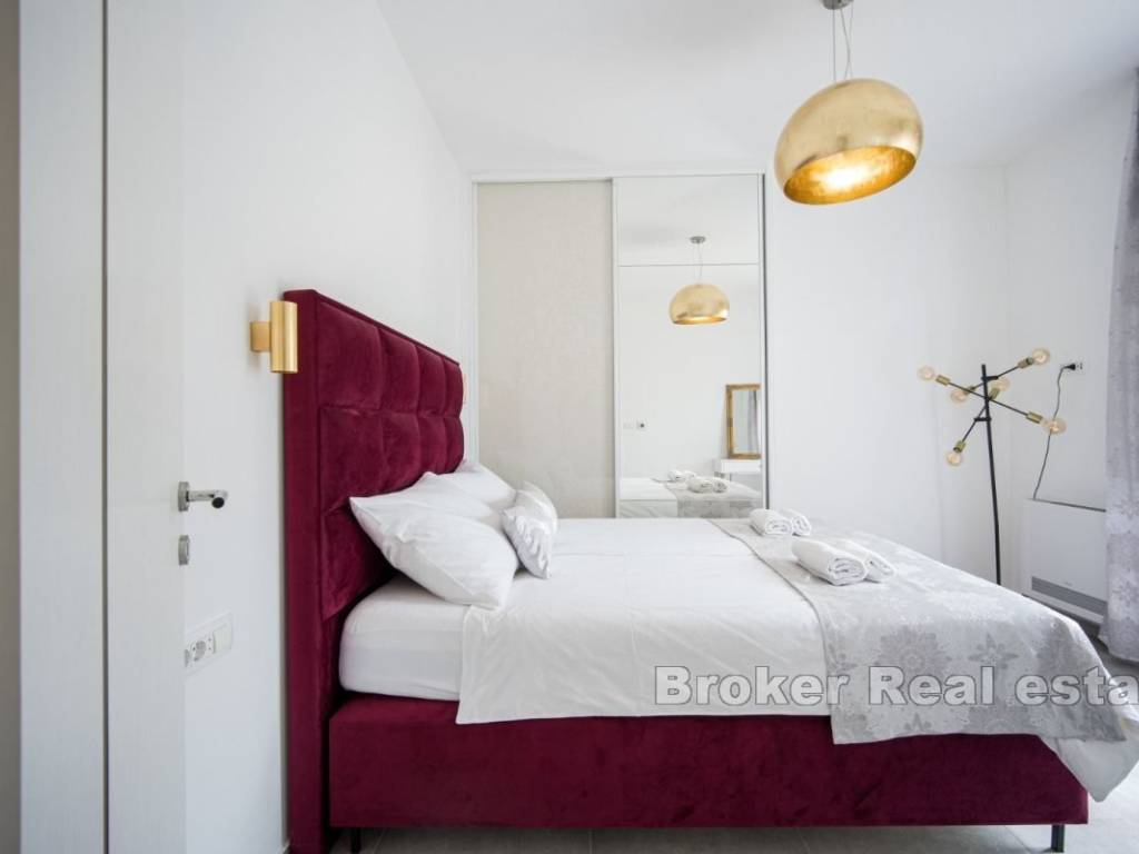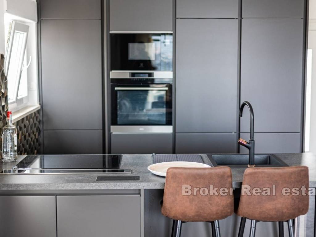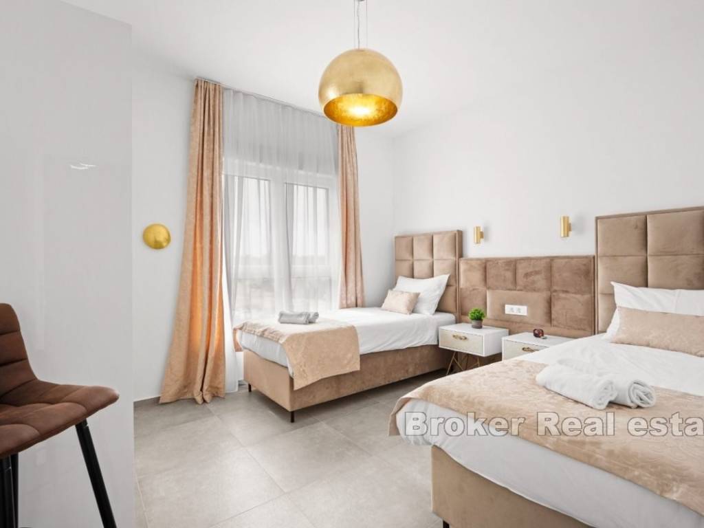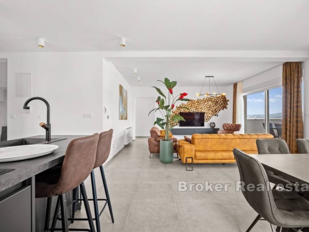Osim raskošnog interijera, ovaj penthouse odiše osjećajem mira i profinjenosti, obećavajući najveću privatnost i izravan pristup netaknutoj šljunčanoj plaži. Svojom strateškom lokacijom, povezanom s kopnom mostom, stanovnici uživaju nesmetan pristup Zračnoj luci Split i mnoštvu sadržaja i atrakcija. Osim za ugodno utočište uz obalu ova nekretnina pruža izuzetnu priliku za turističko iznajmljivanje.