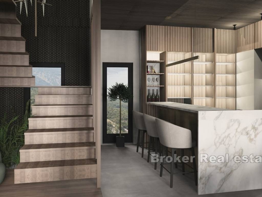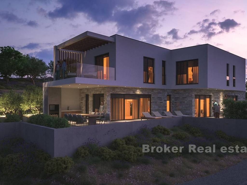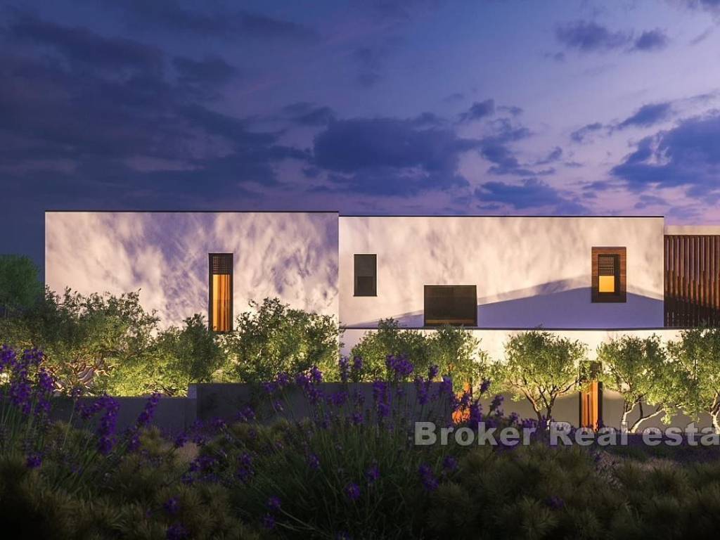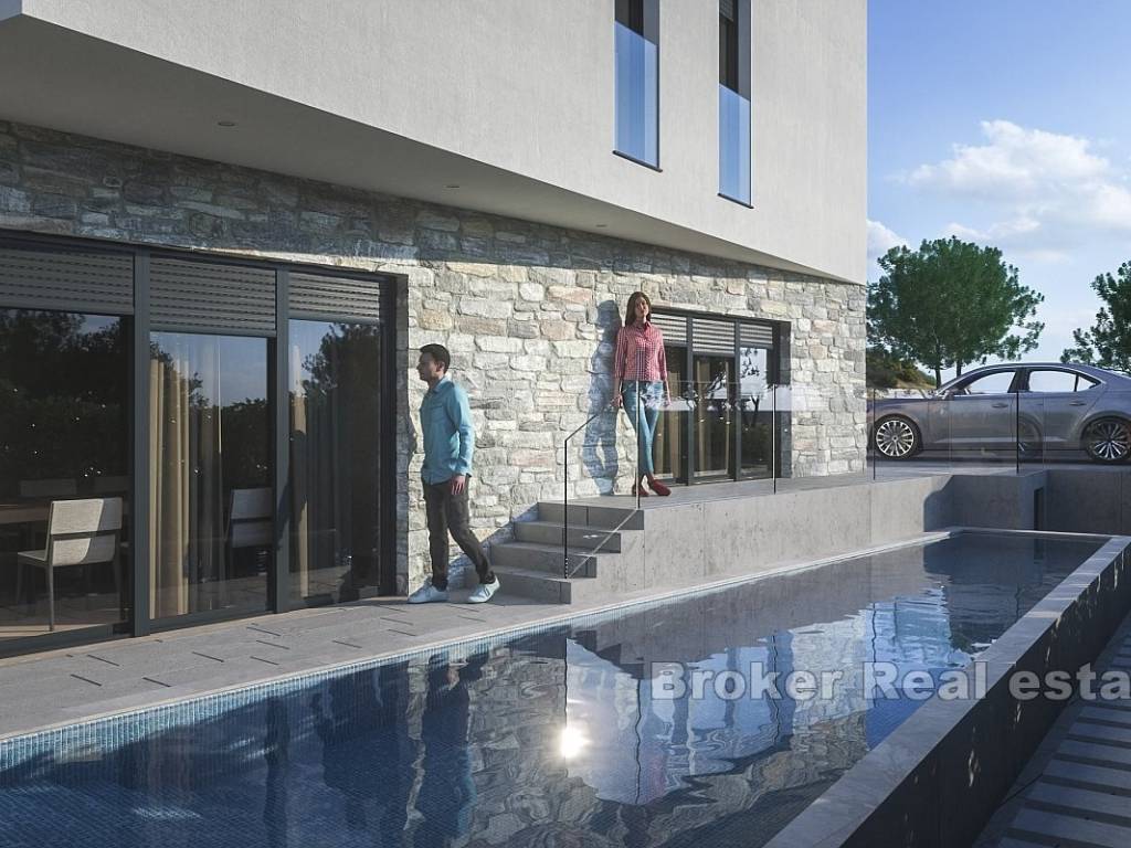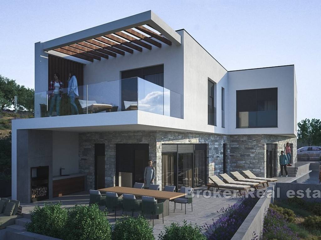 Na prodaju je novoizgrađena vila s bazenom i pogledom na more smještena u gradu Primoštenu. Nekretnina se prostire na dvije etaže i ima ukupnu stambenu površinu od 250 m2. Smjestila se na zemljištu ukupne površine 550 m2.