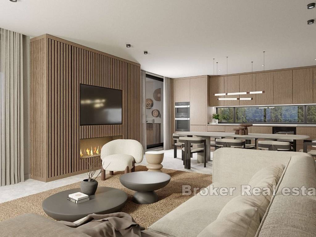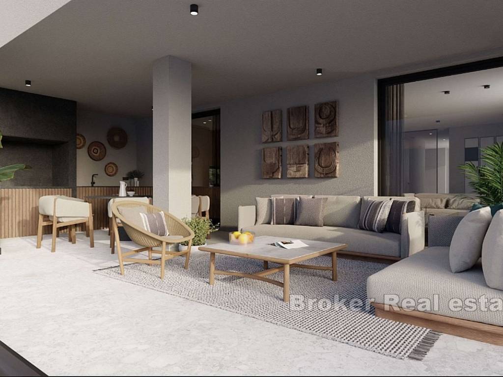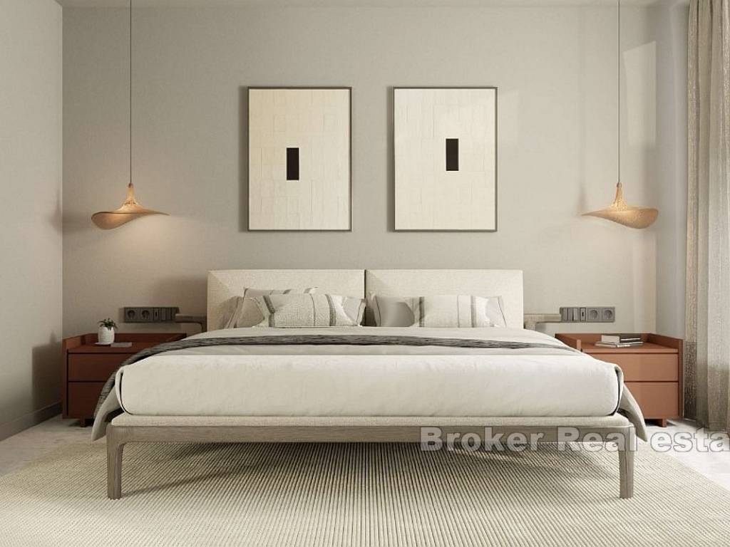 U cijeni stana je garaža, ukupno tri parking mjesta. U cijeni su i potpuno opremljena kupaonica, kuhinja, klima uređaji i krovni bazen. Zgrada se gradi iznimno kvalitetno, te će budućim vlasnicima pružiti maksimalnu udobnost.