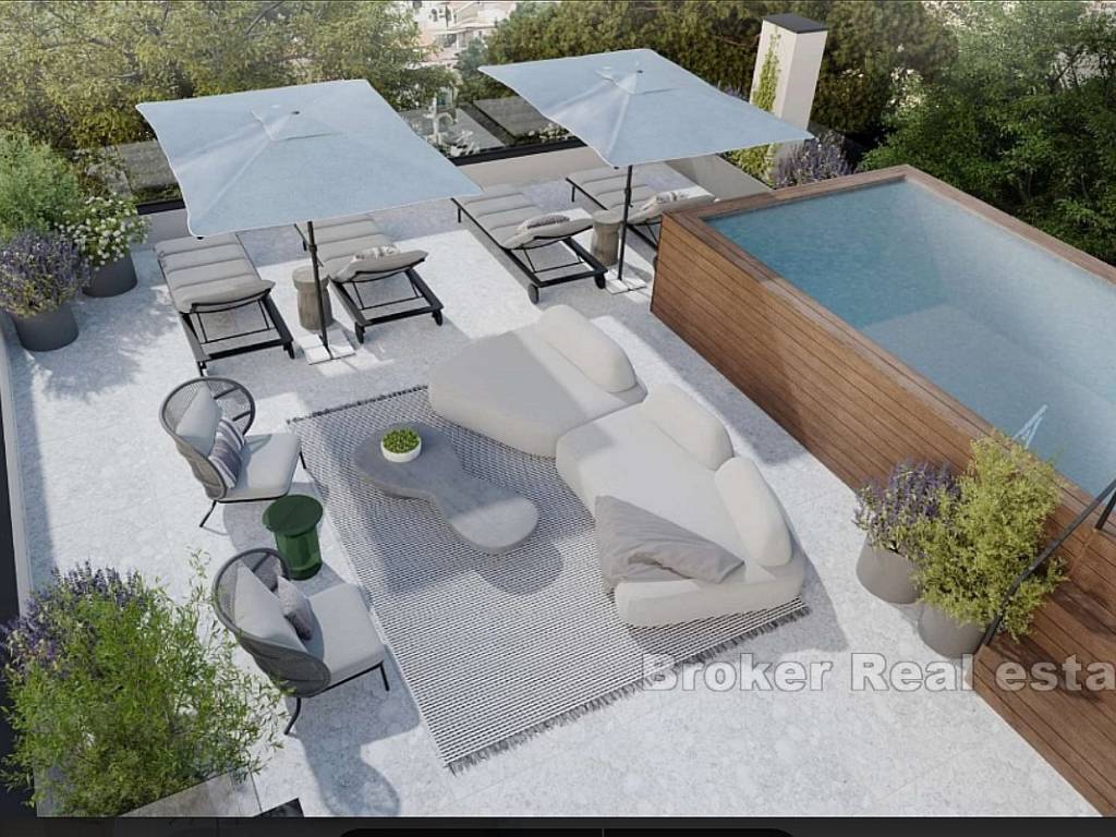 Na prodaju se stavlja luksuzni penthouse u novogradnji s bazenom u mirnom djelu Primoštena. Stan se sastoji od 3 spavaće sobe, 3 kupaonice, dnevnog boravka i kuhinje otvorenog koncepta te prostrane terase te krovne terase na kojoj će biti bazen. Ukupna površina sa svim pripadcima iznosi 185m2.