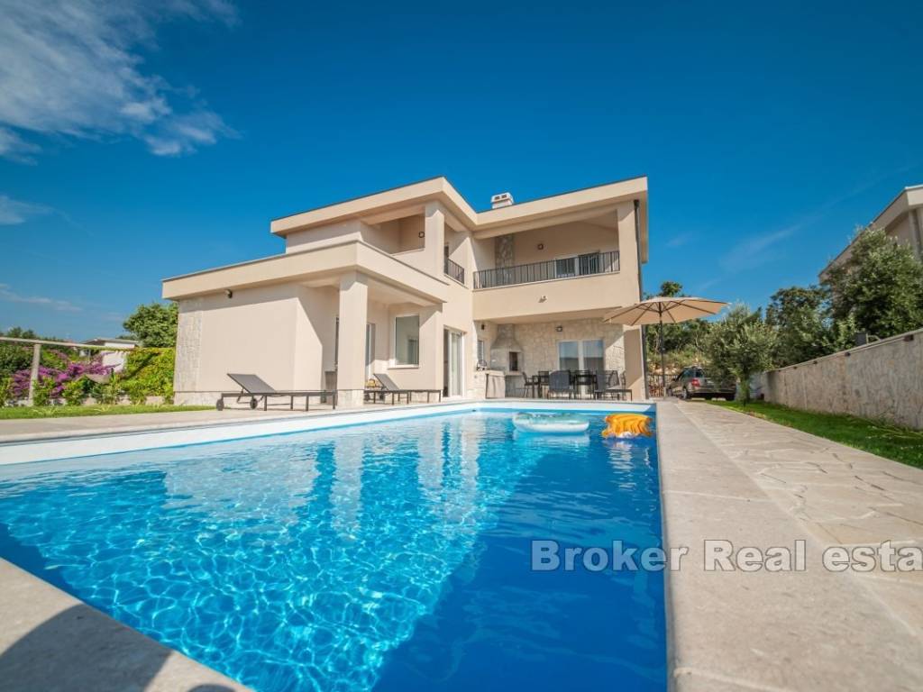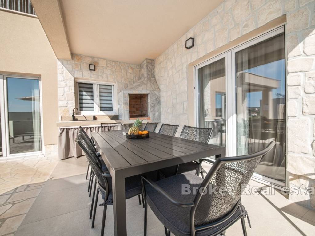 Okućnica je ograđena i nudi potpunu privatnost, a obuhvaća grijani bazen sa sunčalištem te kamin s vanjskom kuhinjom, idealno za opuštanje i druženje na otvorenom. U neposrednoj blizini nalazi se prekrasna pješčana plaža, kao i brojne skrivene šljunčane i stjenovite uvale.