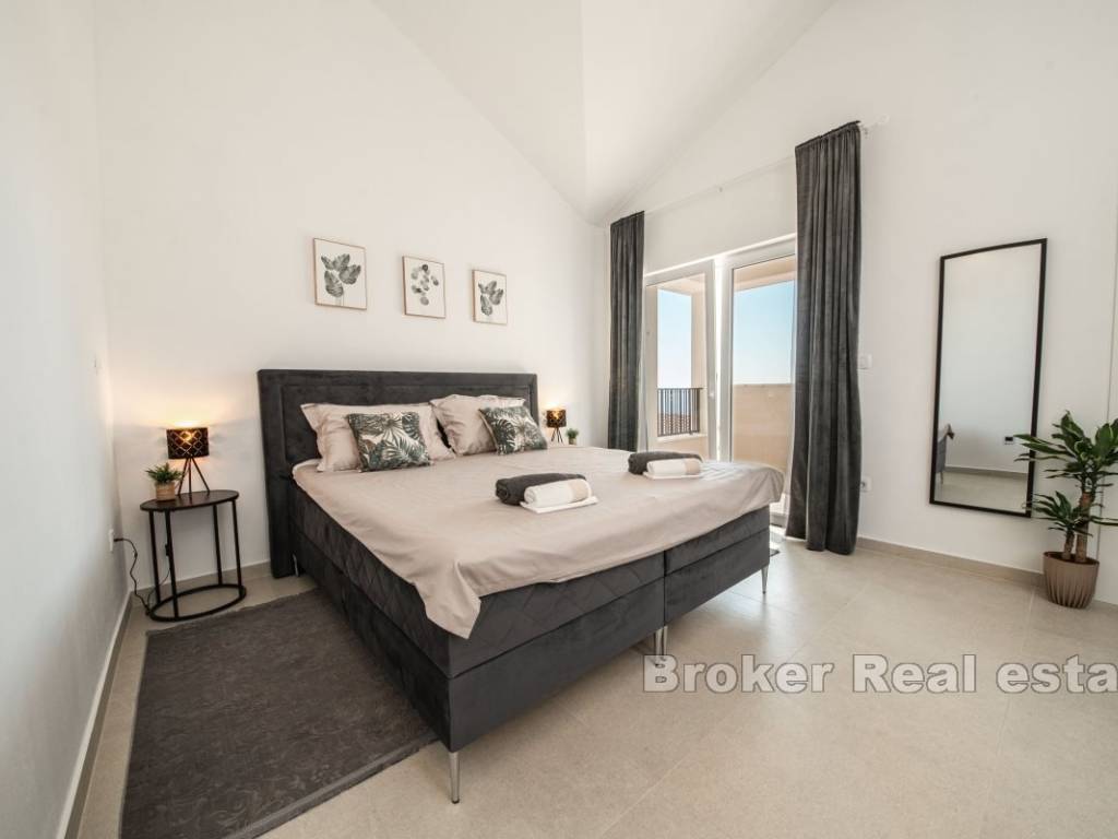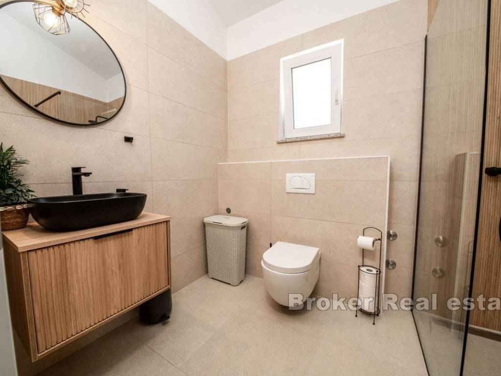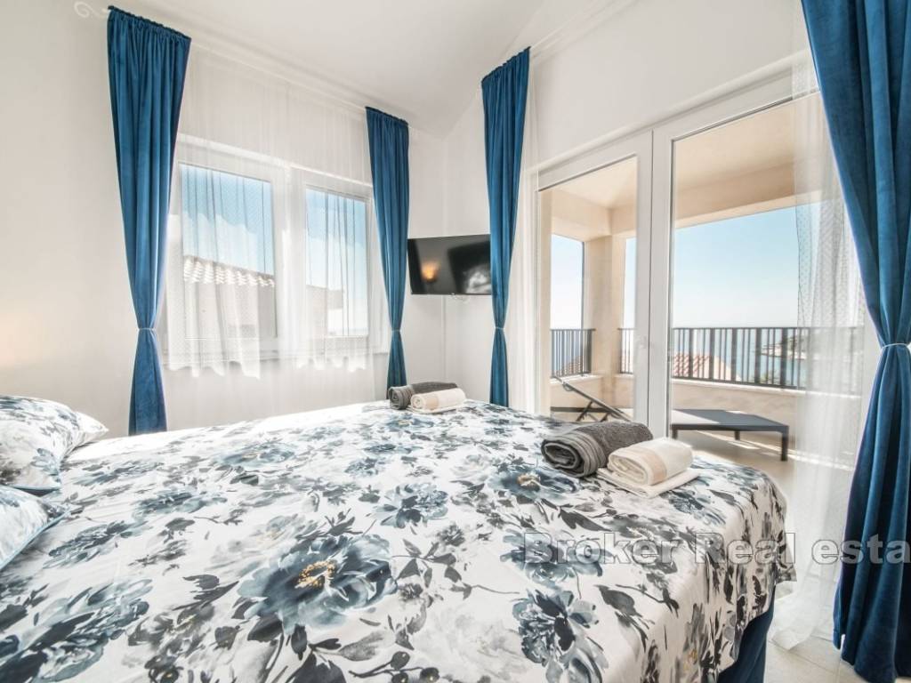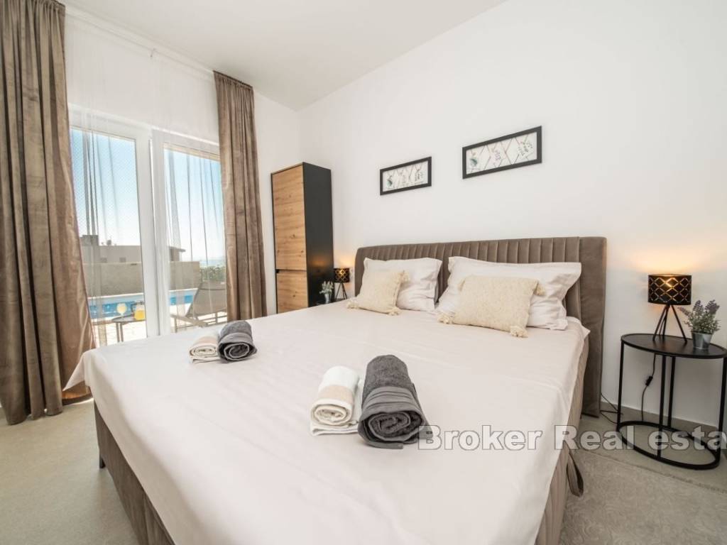 Prizemlje kuće sastoji se od prostrane spavaće sobe s vlastitom kupaonicom, dodatnog toaleta, ostave, potpuno opremljene kuhinje s blagovaonicom te udobnog dnevnog boravka s izlazom na pažljivo uređenu okućnicu. Na gornjoj etaži nalaze se dvije luksuzne spavaće sobe, svaka s privatnom kupaonicom i izlazom na natkrivenu terasu koja nudi predivan pogled na more.