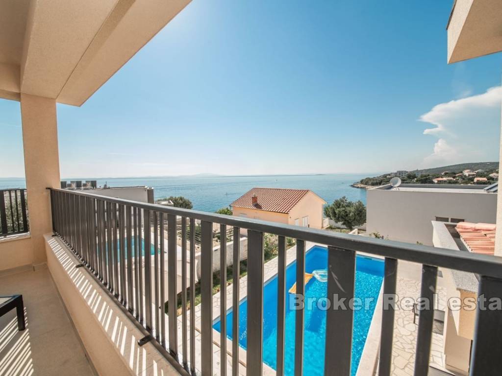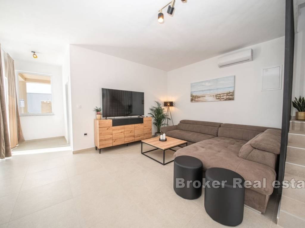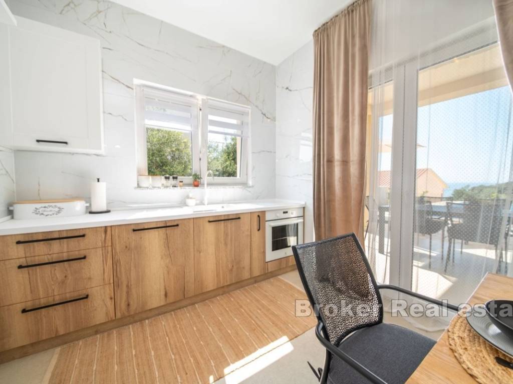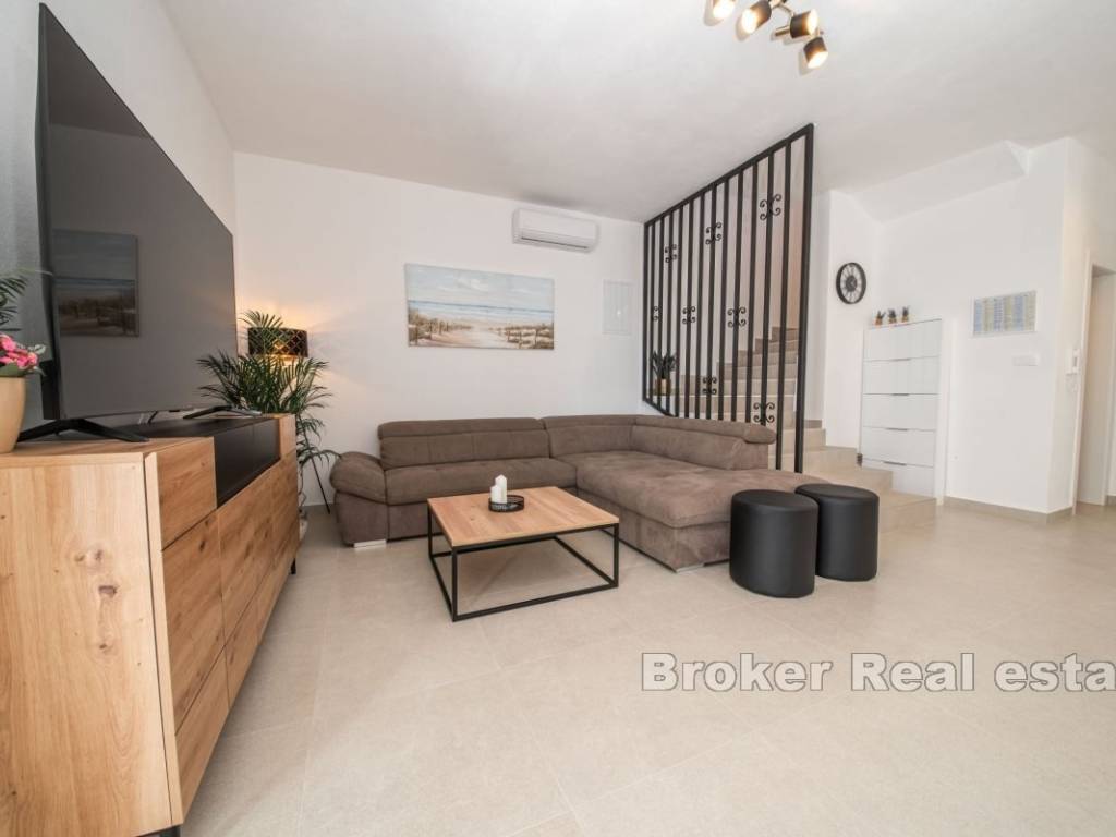 Prizemlje kuće sastoji se od prostrane spavaće sobe s vlastitom kupaonicom, dodatnog toaleta, ostave, potpuno opremljene kuhinje s blagovaonicom te udobnog dnevnog boravka s izlazom na pažljivo uređenu okućnicu. Na gornjoj etaži nalaze se dvije luksuzne spavaće sobe, svaka s privatnom kupaonicom i izlazom na natkrivenu terasu koja nudi predivan pogled na more.