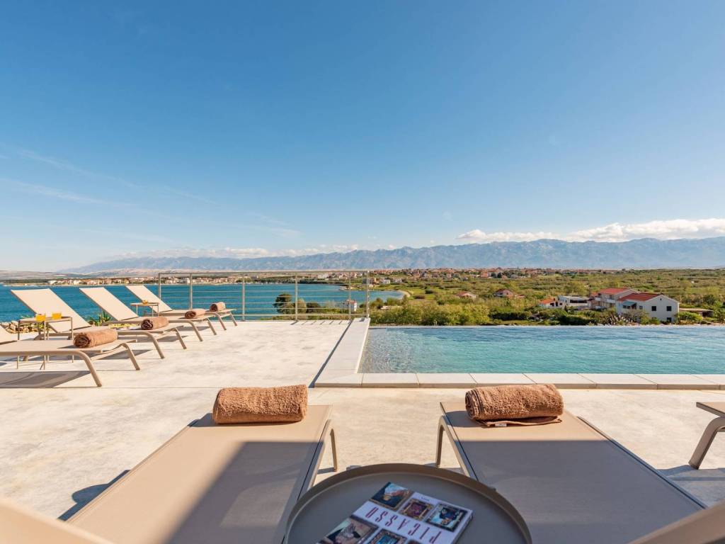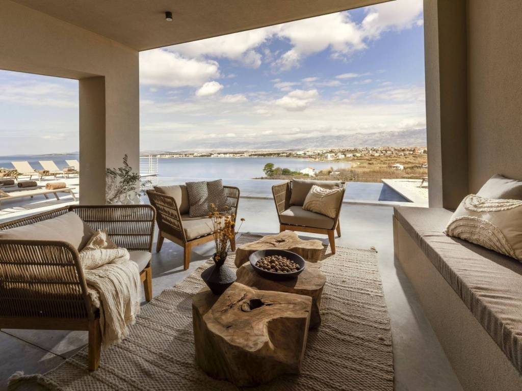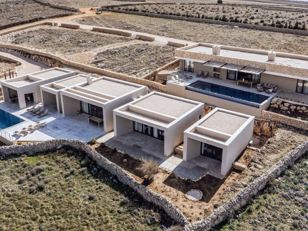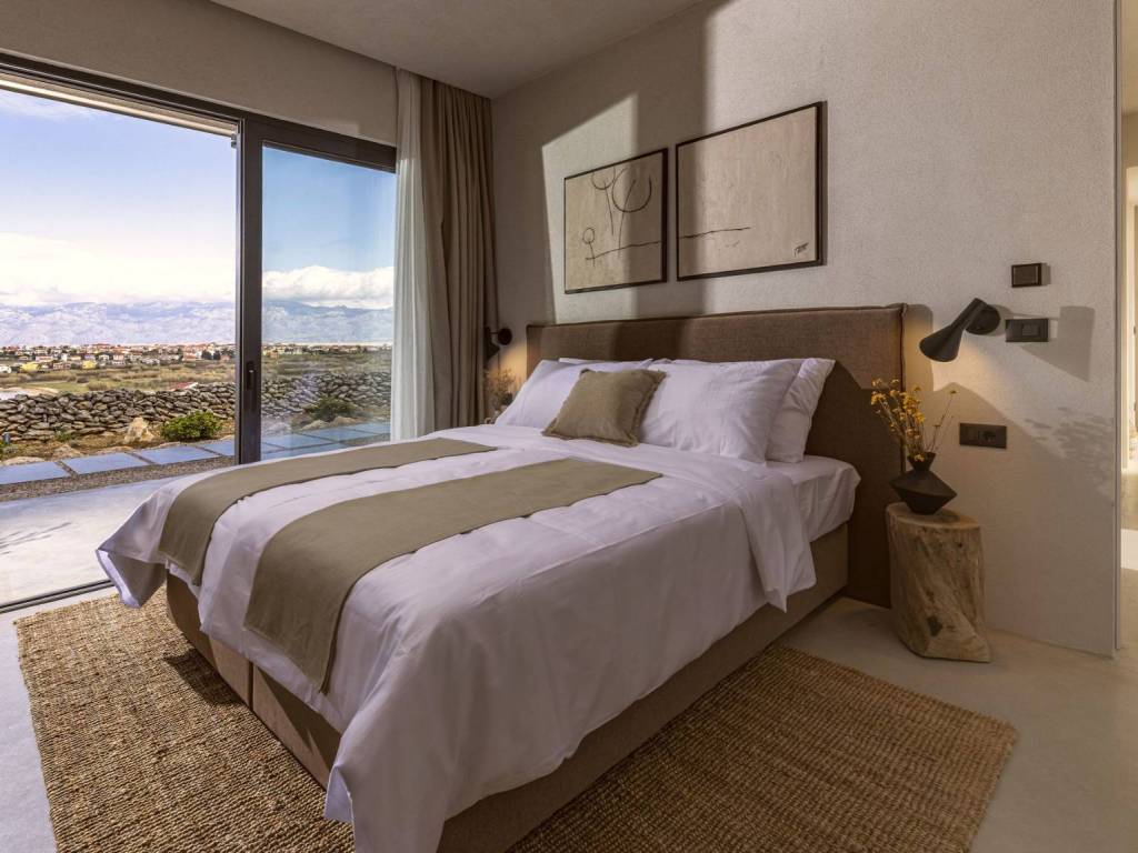 Egzotična vila smještena na jedinstvenoj lokaciji, utopljena u prirodno kamenito okruženje otoka Paga, uživajući u veličanstvenom pogledu na more. U apsolutnoj tišini i miru ova prestižna rezidencija s nenametljivim luksuzom i pažnjom na detalje uključuje pet cjelina od kojih su dvije zasebne te se mogu koristiti kao dva studio apartmana ili dvije spavaće sobe. Tri cjeline su povezane atraktivnim staklenim hodnikom te se sastoje od toaleta, ostave, tri udobne spavaće sobe s kupaonicama i dnevnog boravka s kuhinjom i blagovaonicom. Sve prostorije nude izlazi na prostranu terasu s grijanim bazenom i sunčalištem. Ovaj šarmantan posjed nudi utočište mira, moderan i opušten stil života nedaleko od mora i plaže.