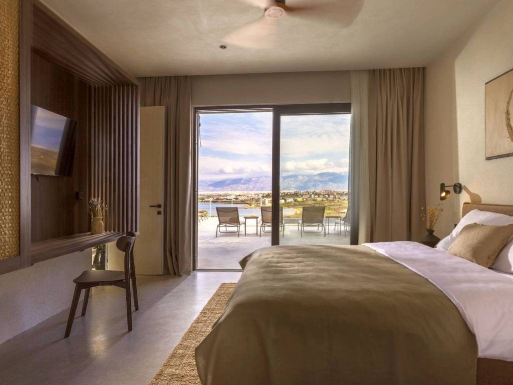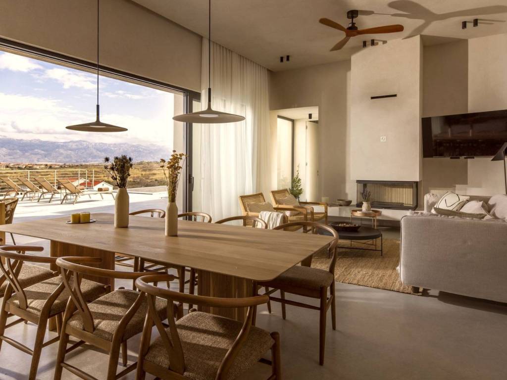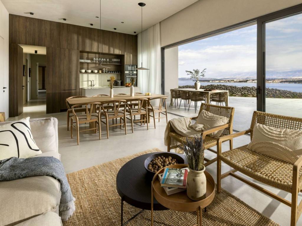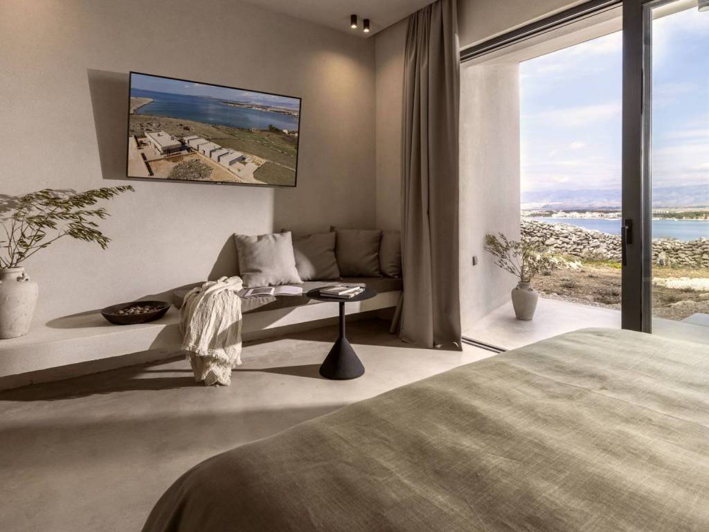 Egzotična vila smještena na jedinstvenoj lokaciji, utopljena u prirodno kamenito okruženje otoka Paga, uživajući u veličanstvenom pogledu na more. U apsolutnoj tišini i miru ova prestižna rezidencija s nenametljivim luksuzom i pažnjom na detalje uključuje pet cjelina od kojih su dvije zasebne te se mogu koristiti kao dva studio apartmana ili dvije spavaće sobe. Tri cjeline su povezane atraktivnim staklenim hodnikom te se sastoje od toaleta, ostave, tri udobne spavaće sobe s kupaonicama i dnevnog boravka s kuhinjom i blagovaonicom. Sve prostorije nude izlazi na prostranu terasu s grijanim bazenom i sunčalištem. Ovaj šarmantan posjed nudi utočište mira, moderan i opušten stil života nedaleko od mora i plaže.