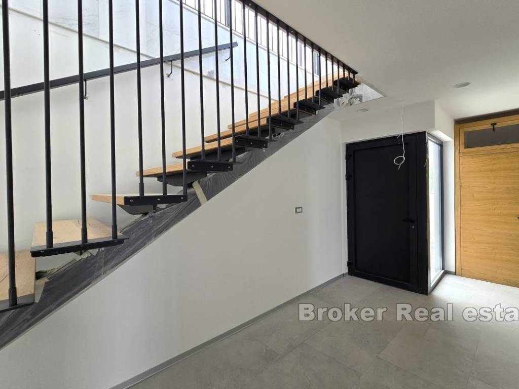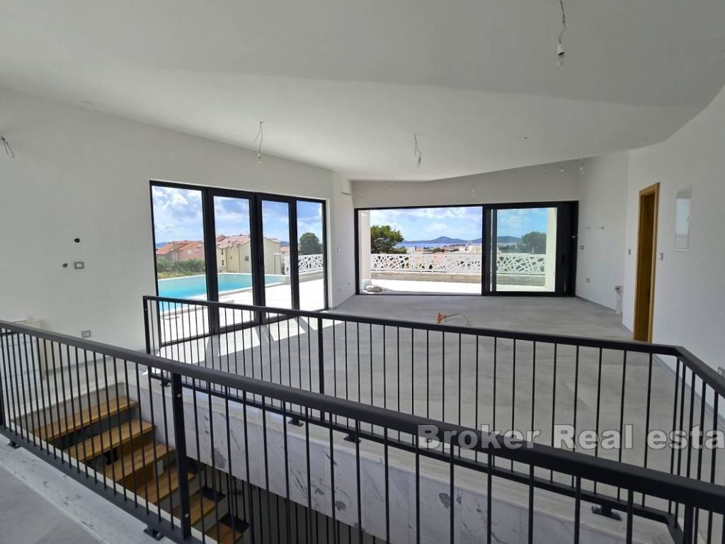 Unutarnjim stepeništem se dolazi do kata na kojem se nalazi prostor otvorenog koncepta s dnevnim boravkom, kuhinjom i blagovaonicom. Na istoj etaži se također nalazi gostinski WC te prostrana terasa s bazenom i pogledom na more.