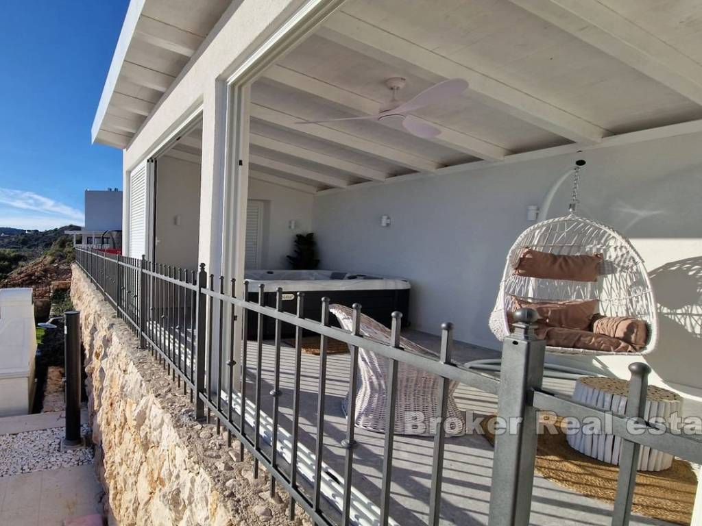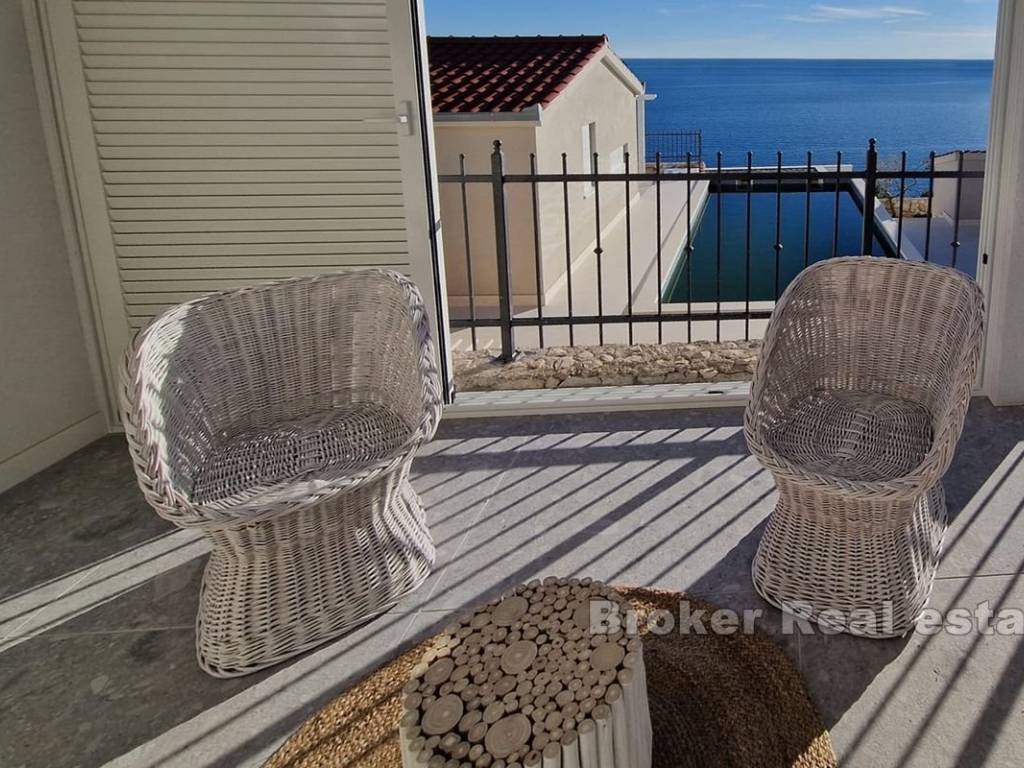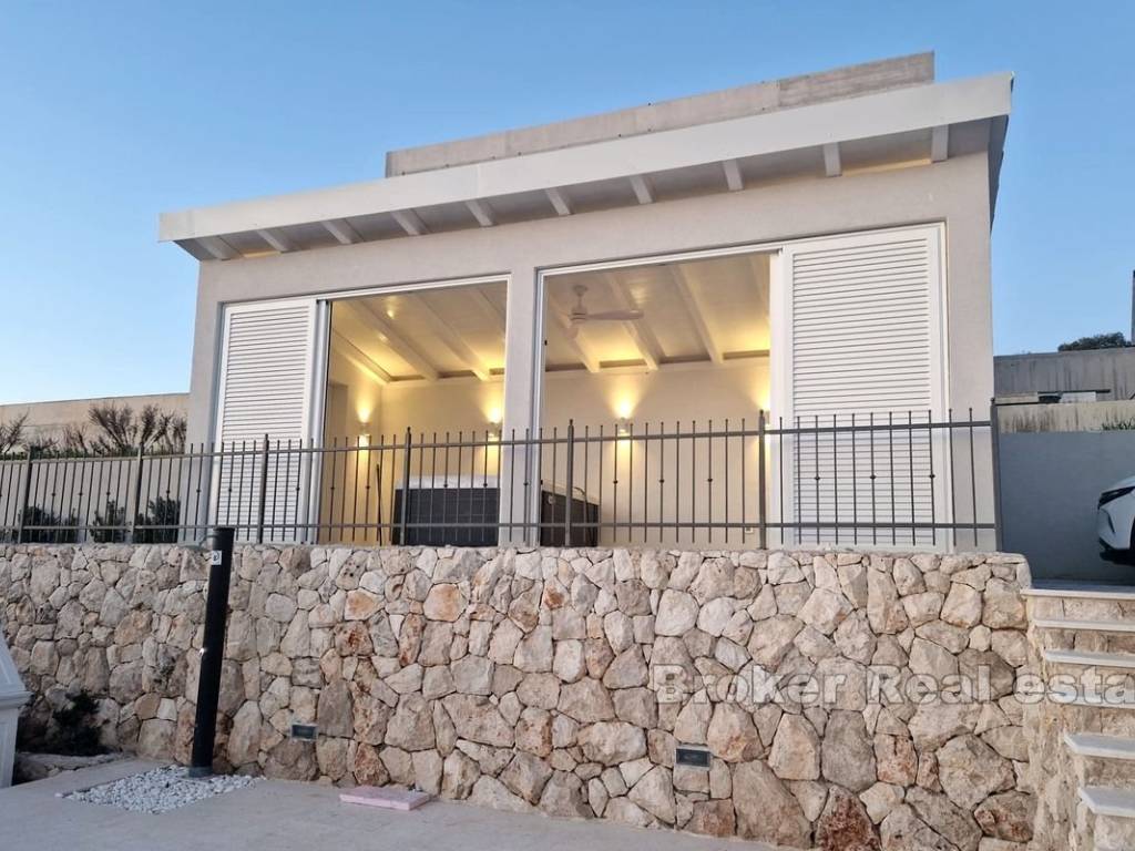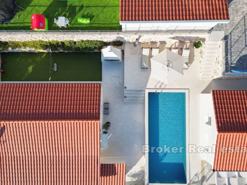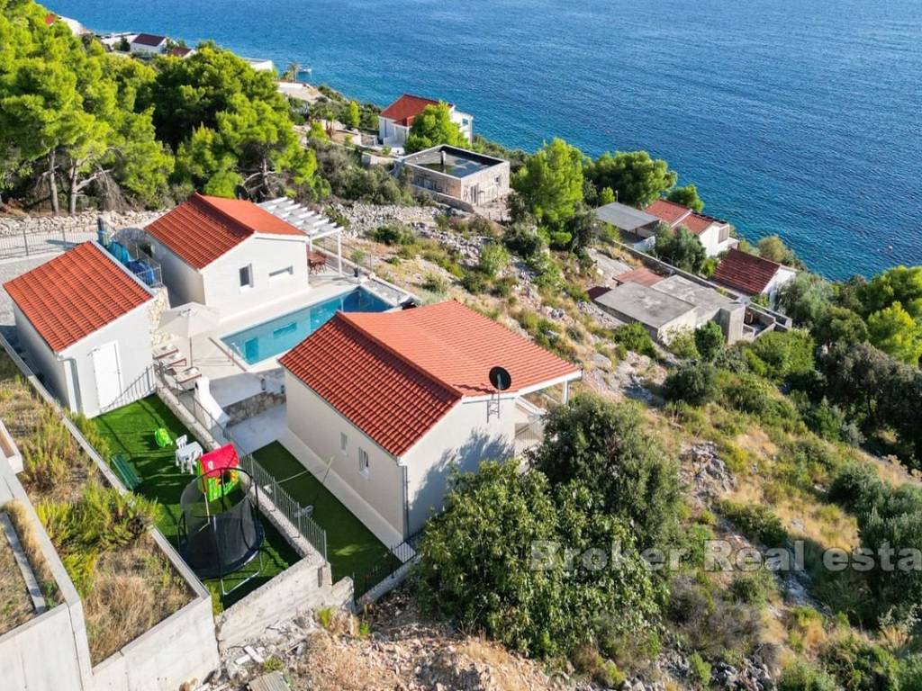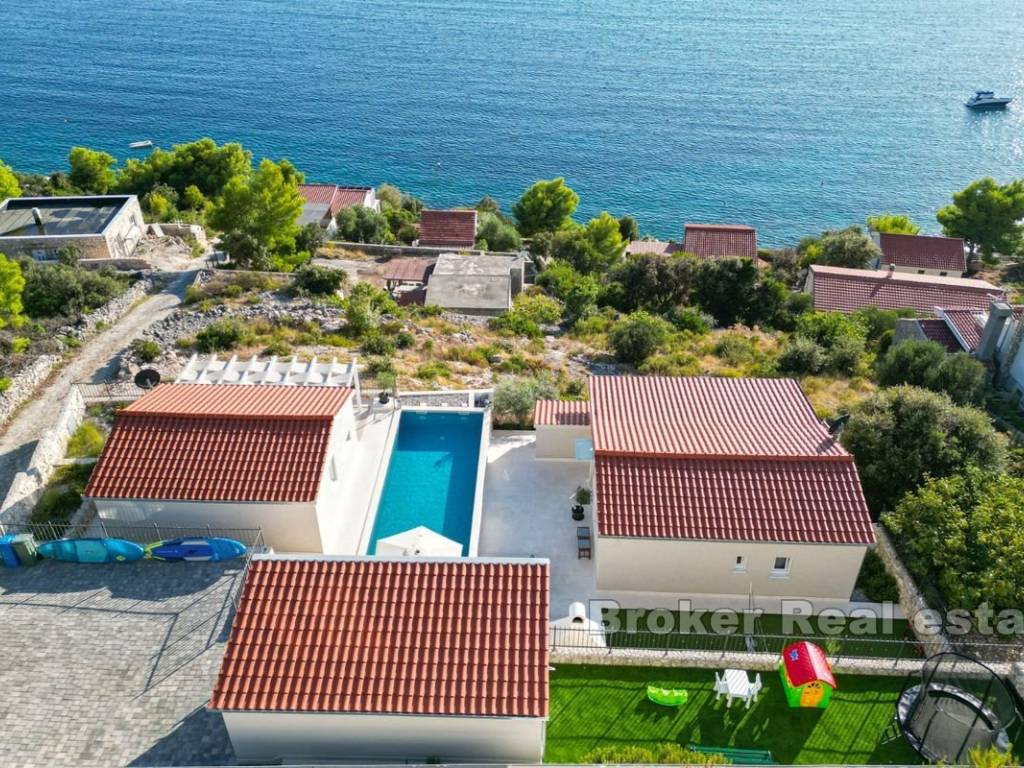 Moderno dizajnirana kuća s dvije stambene jedinice, zajedničkim bazenom i ljetnikovcem, te pruža jedinstvenu priliku na tržištu s prekrasnim, neometanim pogledom na more.