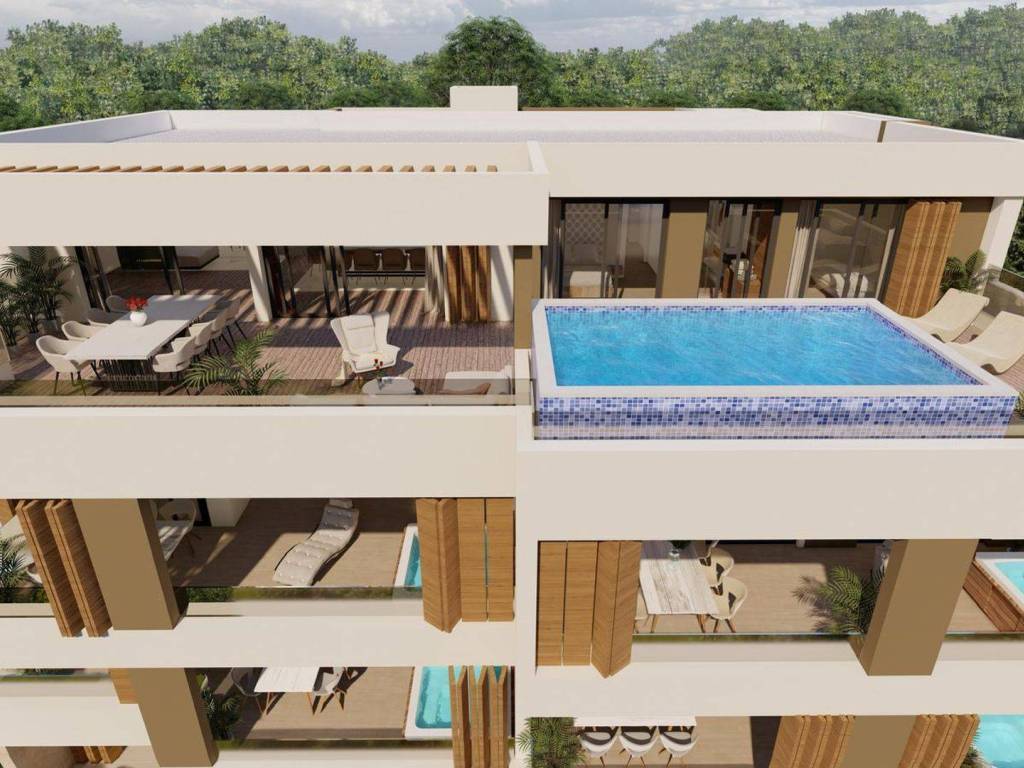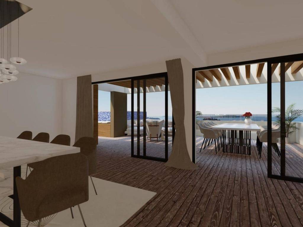 Ovaj prostrani stan od ukupno 255 m2 stambenog prostora sastoji se od velikog otvorenog prostora (89 m2) u kojem se nalaze dnevni boravak, kuhinja i blagovaonica. Sadrži tri sobe, wc, i dvije kupaonice od kojih jedna sadrži saunu. Osim velike lođe od 35m2, stan sadrži i prostranu terasu od 74 m2 s koje se pruža otvoreni pogled na more i otoke. Na terasi je predviđen prostor za druženje i bazen.