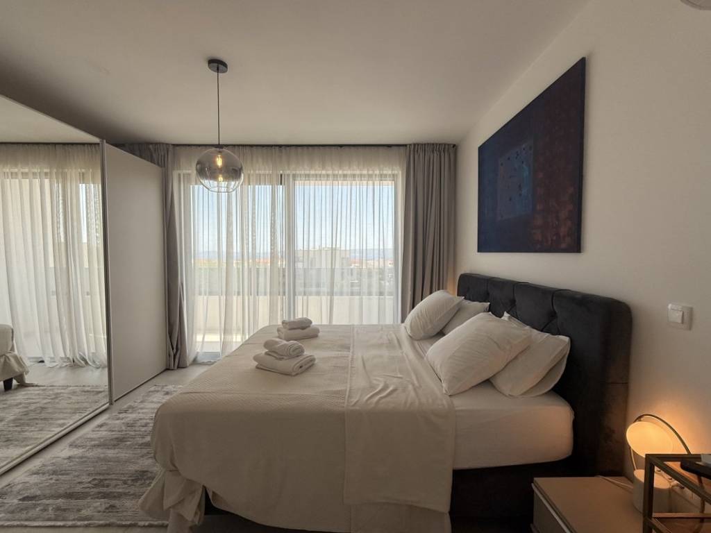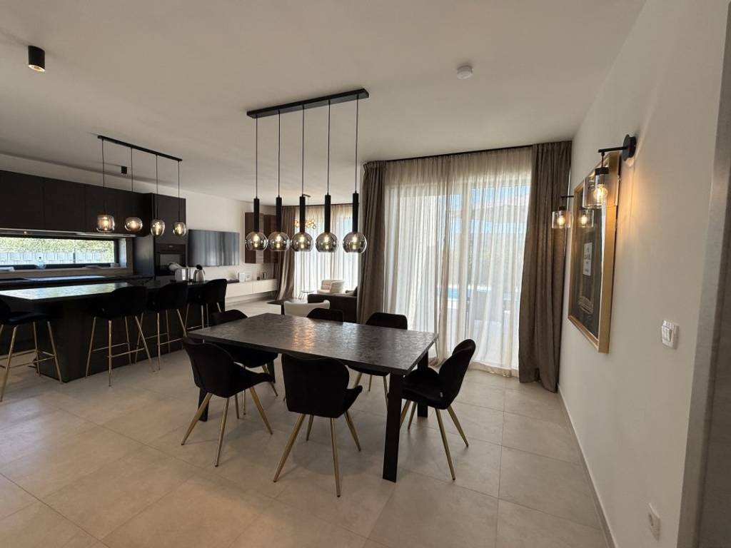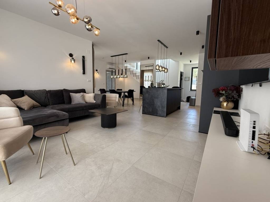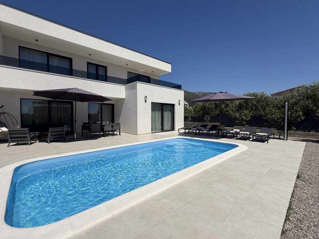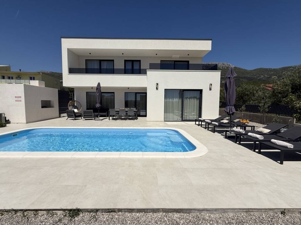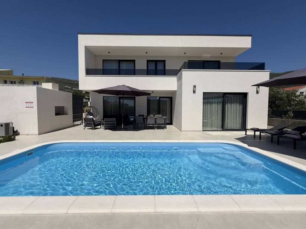 Na prodaju kuća s bazenom koja se prostire se na 257 m2 stambene površine položena na zemljištu ukupne površine 938 m2 u Kaštelima. Kuća je novogradnja moderno opremljema kvalitetnim namještajem koji ulazi u cijenu nekretnine. Ova moderna novogradnja je projektirana kao kuća za odmor kao i kuća za obiteljski život zbog svoje blizine svih bitnih sadržaja za ugodan život i odmor. Kuća se sastoji od prizemlja i prve etaže. U prizemlju se nalazi kuhinja s blagavaonicom, dnevnim boravkom i sobom s kupatilom te toaletom s vešerajem. Na prvoj etaži se nalaze dvije sobe s kupatilima i terasama s kojih se pruža prekrasan pogled na more. Kuća je opremljena bazenom, roštiljem, parkirnim mjestima za 6 automobila, klima uređajima