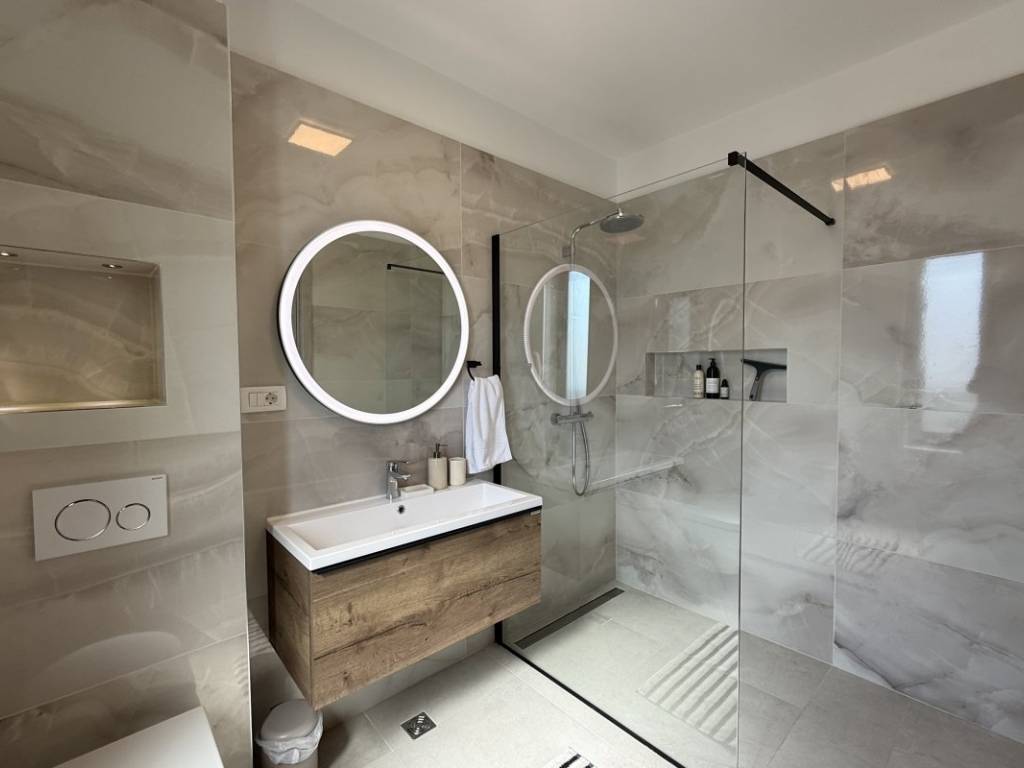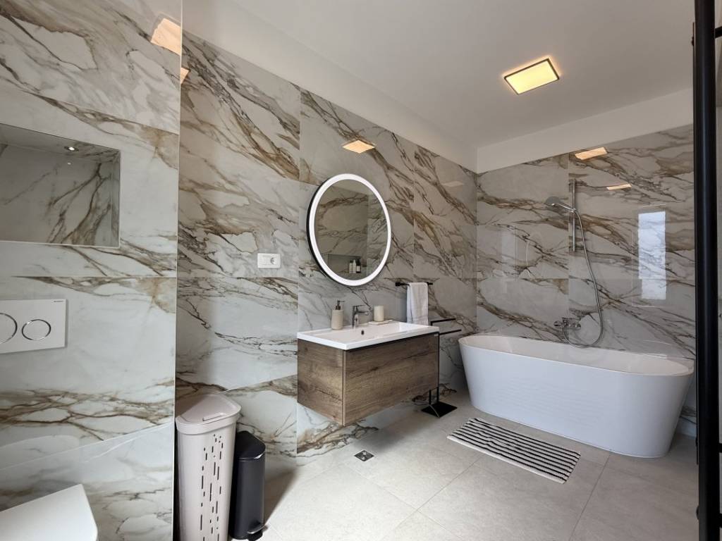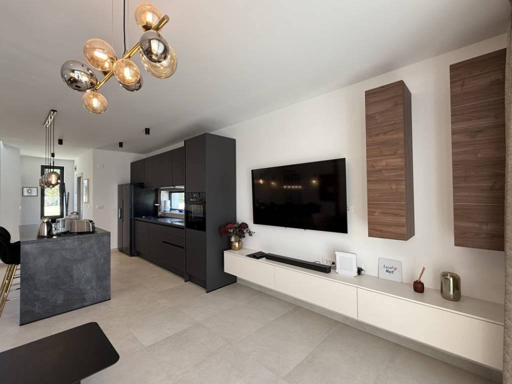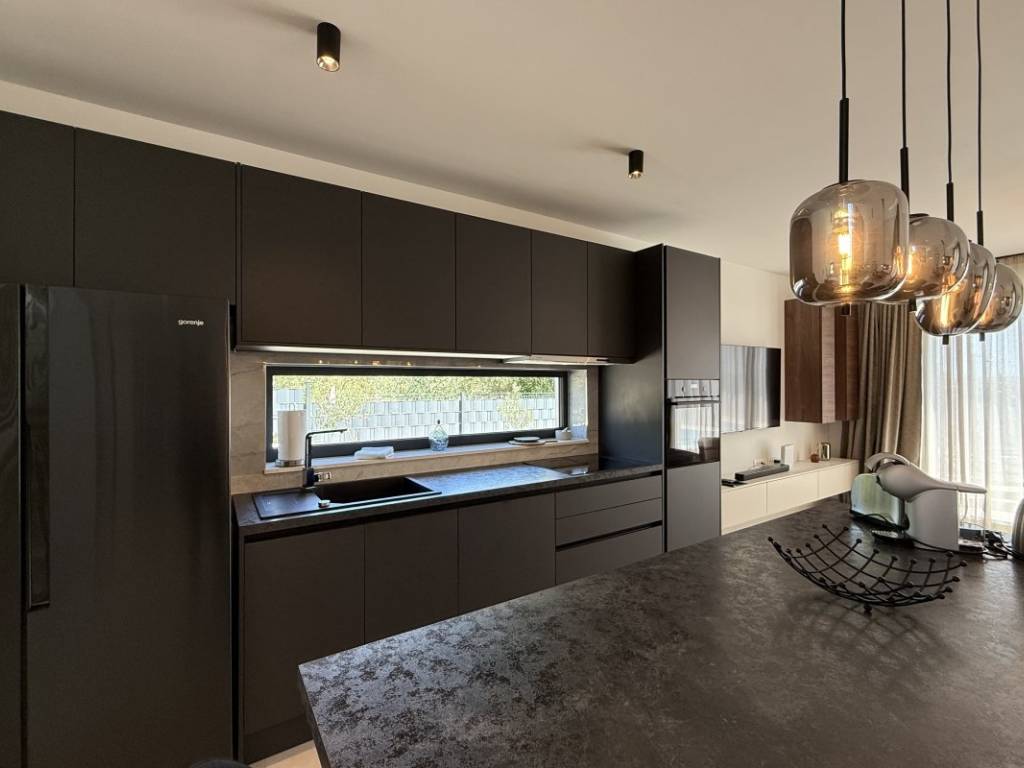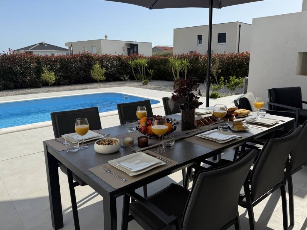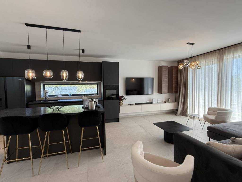 Na prodaju kuća s bazenom koja se prostire se na 257 m2 stambene površine položena na zemljištu ukupne površine 938 m2 u Kaštelima. Kuća je novogradnja moderno opremljema kvalitetnim namještajem koji ulazi u cijenu nekretnine. Ova moderna novogradnja je projektirana kao kuća za odmor kao i kuća za obiteljski život zbog svoje blizine svih bitnih sadržaja za ugodan život i odmor. Kuća se sastoji od prizemlja i prve etaže. U prizemlju se nalazi kuhinja s blagavaonicom, dnevnim boravkom i sobom s kupatilom te toaletom s vešerajem. Na prvoj etaži se nalaze dvije sobe s kupatilima i terasama s kojih se pruža prekrasan pogled na more. Kuća je opremljena bazenom, roštiljem, parkirnim mjestima za 6 automobila, klima uređajima