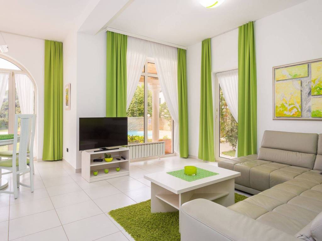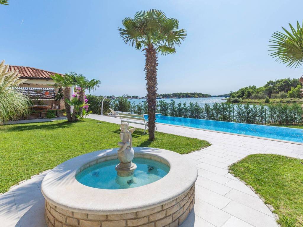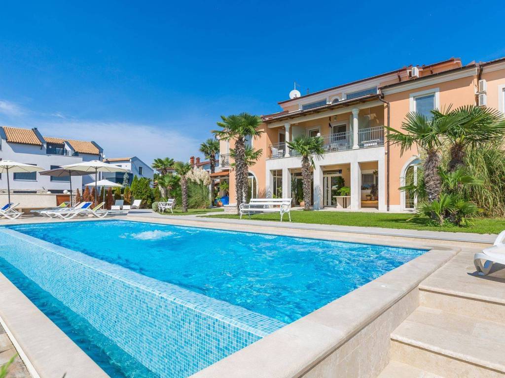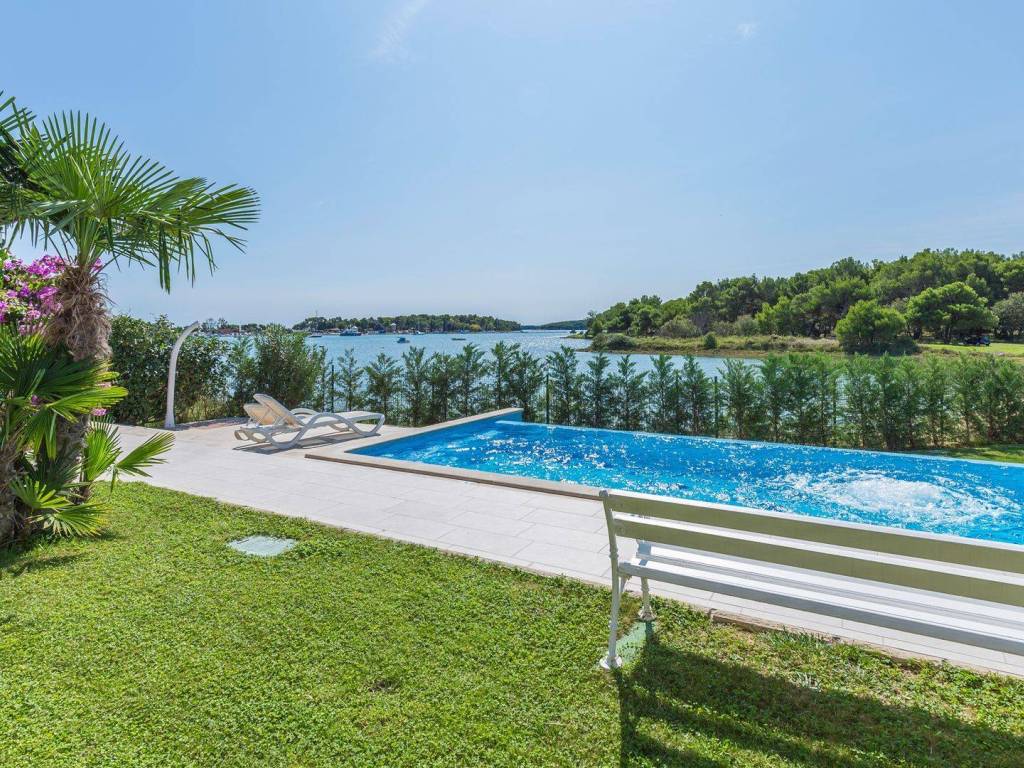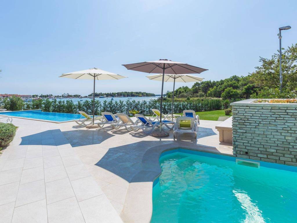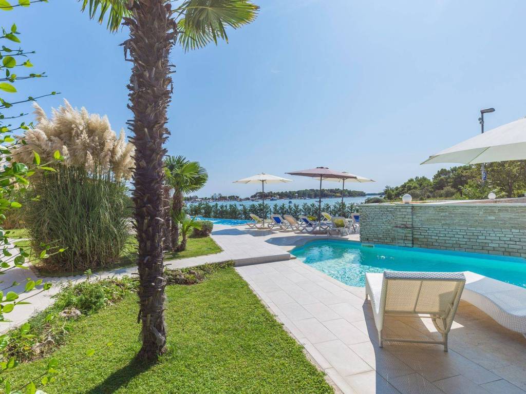 koji su kompletno opremljeni: centralno grijanje, LCD satelitska TV, klima uređaji, sef sa personaliziranim PIN-om, balkon itd U 7 apartmana od ukupno 8 može se uživati u prekrasnom pogledu na more, a dva dvosobna apartmana imaju po ukupno dvije kupaonice svaki dok ostali apartmani po jednu kupaonicu. Osim 8 apartmana koji su raspoređeni kroz tri etaže također postoji i dodatna spavaća soba s kupaonicom. Eksterijer kuće čini pomno uređeni i održavani vrt na kojem se nalazi vanjski bazen okružen vanjskim namještajem za sunčanje te vanjski Jacuzzi. Osim bazena i predivnog pogleda na more takodjer se može uživati i u natkrivenoj vanjskoj blagovaonici koja uključuje drveni namještaj te vanjski kameni roštilj. Kuća je na prodaju potpuno namještena a nekretnini pripada ukupno sedam parking mjesta. Udaljena je 8 km zracne linije od centra Pule a u neposrednoj blizini su smješteni svi bitniji sadržaji kao što su trgovina, restoran te tržnica. Zbog jedinstvene lokacije, prvog reda do mora te općenito cjelokupne ponude koju ova nekretnina nudi radi se o izuzetno kvalitetnoj prilici koja nudi potencijal kakav se rijetko viđa na tržištu.