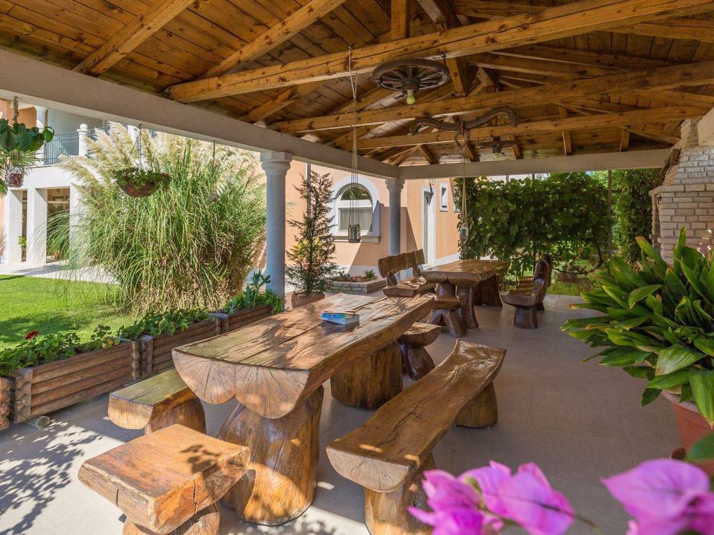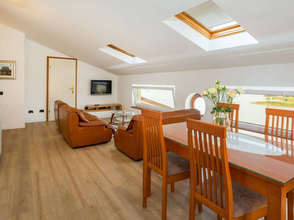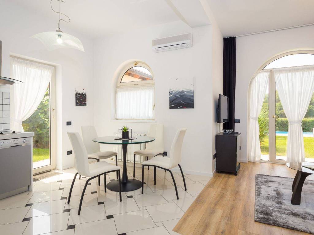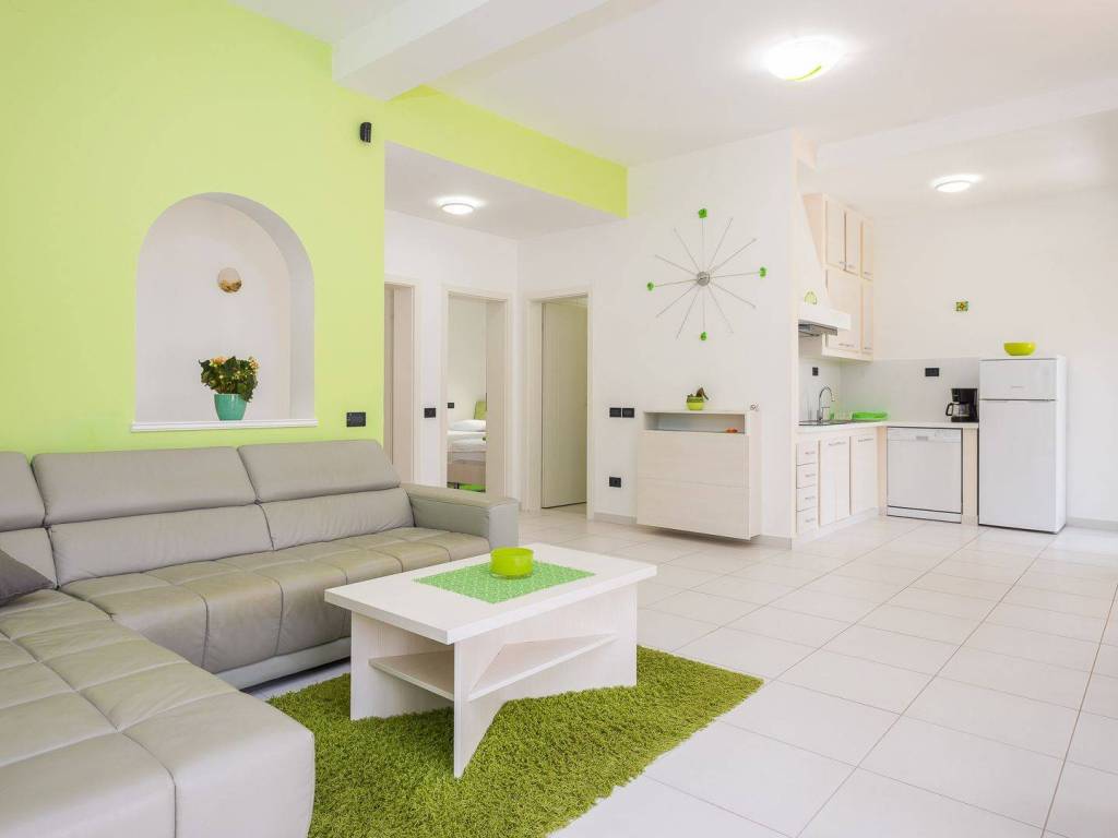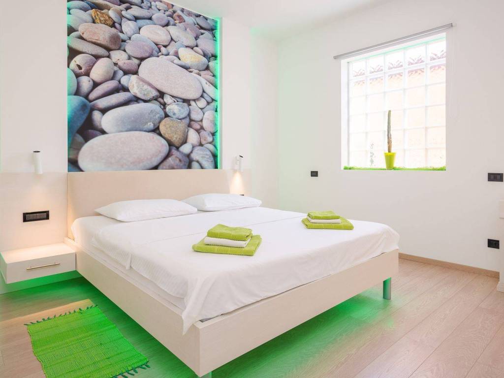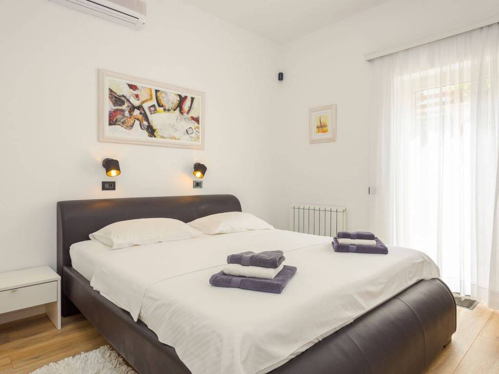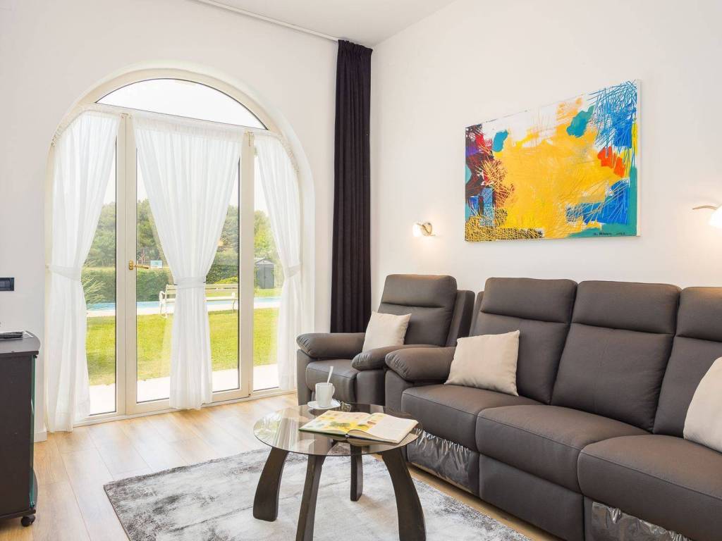 koji su kompletno opremljeni: centralno grijanje, LCD satelitska TV, klima uređaji, sef sa personaliziranim PIN-om, balkon itd U 7 apartmana od ukupno 8 može se uživati u prekrasnom pogledu na more, a dva dvosobna apartmana imaju po ukupno dvije kupaonice svaki dok ostali apartmani po jednu kupaonicu. Osim 8 apartmana koji su raspoređeni kroz tri etaže također postoji i dodatna spavaća soba s kupaonicom. Eksterijer kuće čini pomno uređeni i održavani vrt na kojem se nalazi vanjski bazen okružen vanjskim namještajem za sunčanje te vanjski Jacuzzi. Osim bazena i predivnog pogleda na more takodjer se može uživati i u natkrivenoj vanjskoj blagovaonici koja uključuje drveni namještaj te vanjski kameni roštilj. Kuća je na prodaju potpuno namještena a nekretnini pripada ukupno sedam parking mjesta. Udaljena je 8 km zracne linije od centra Pule a u neposrednoj blizini su smješteni svi bitniji sadržaji kao što su trgovina, restoran te tržnica. Zbog jedinstvene lokacije, prvog reda do mora te općenito cjelokupne ponude koju ova nekretnina nudi radi se o izuzetno kvalitetnoj prilici koja nudi potencijal kakav se rijetko viđa na tržištu.