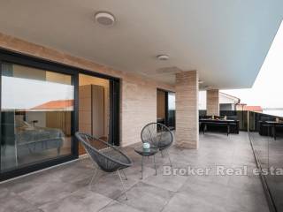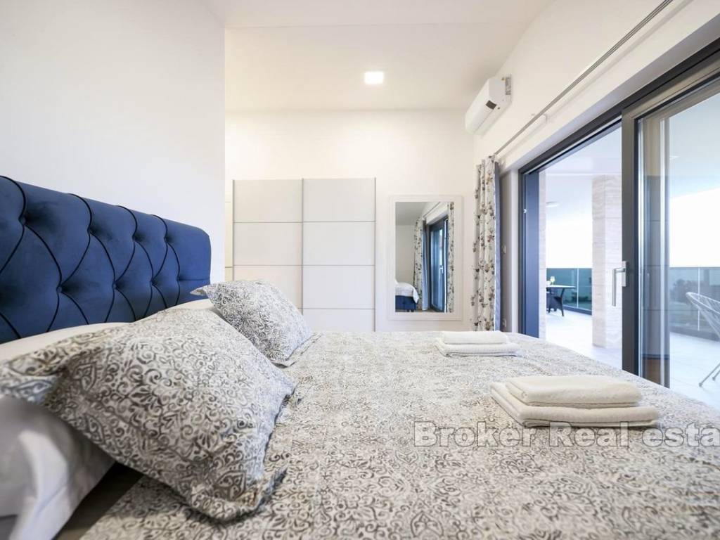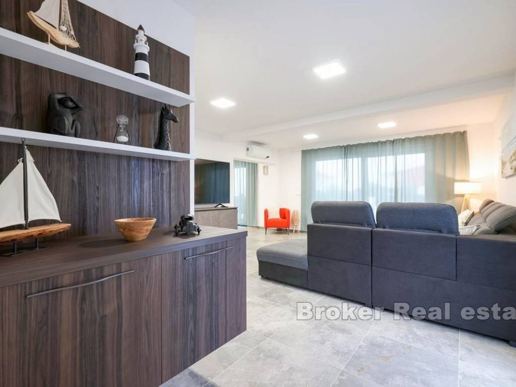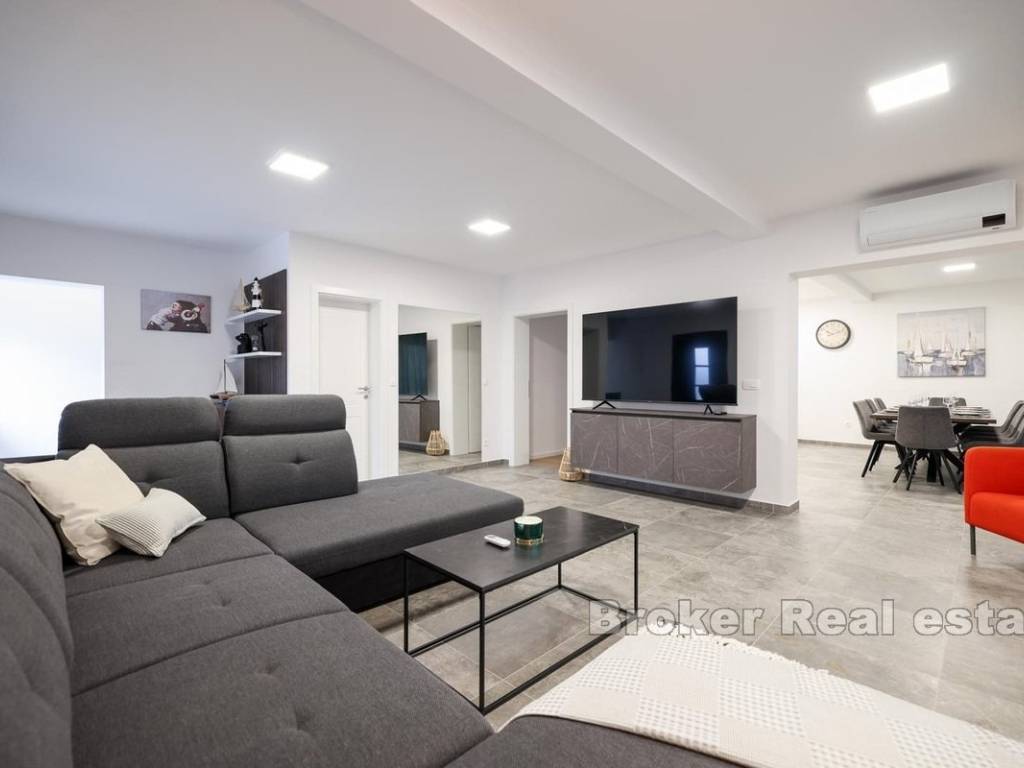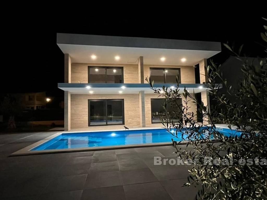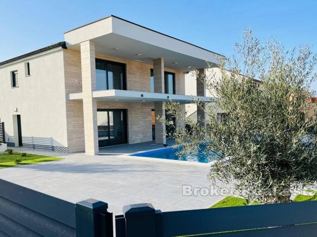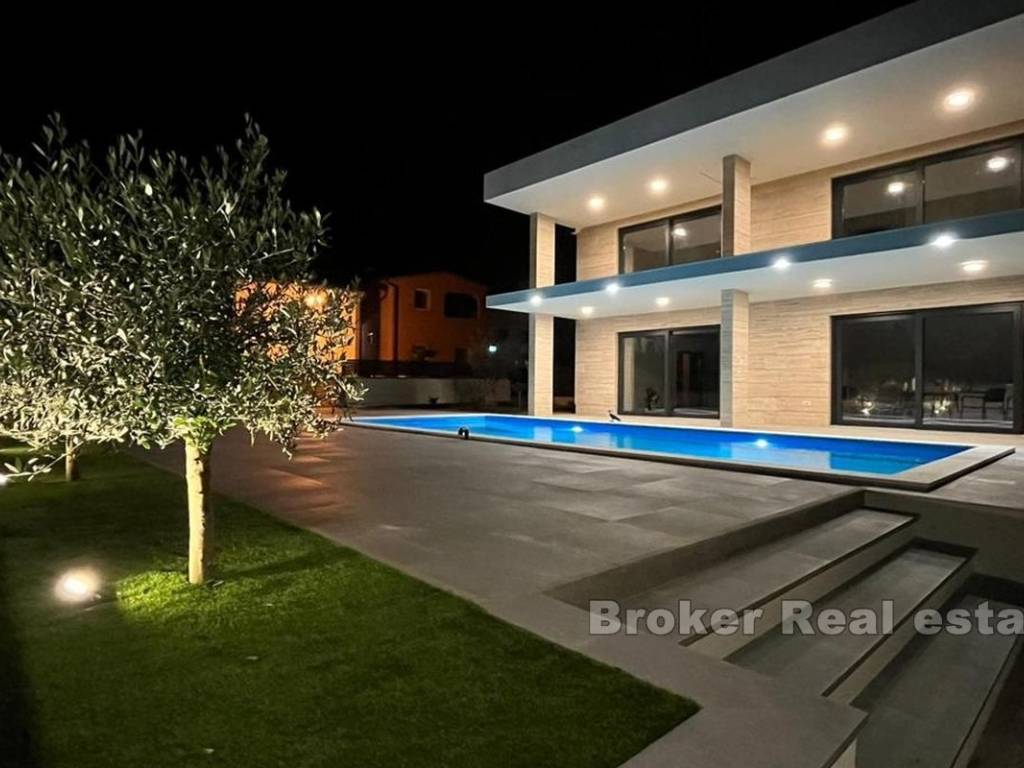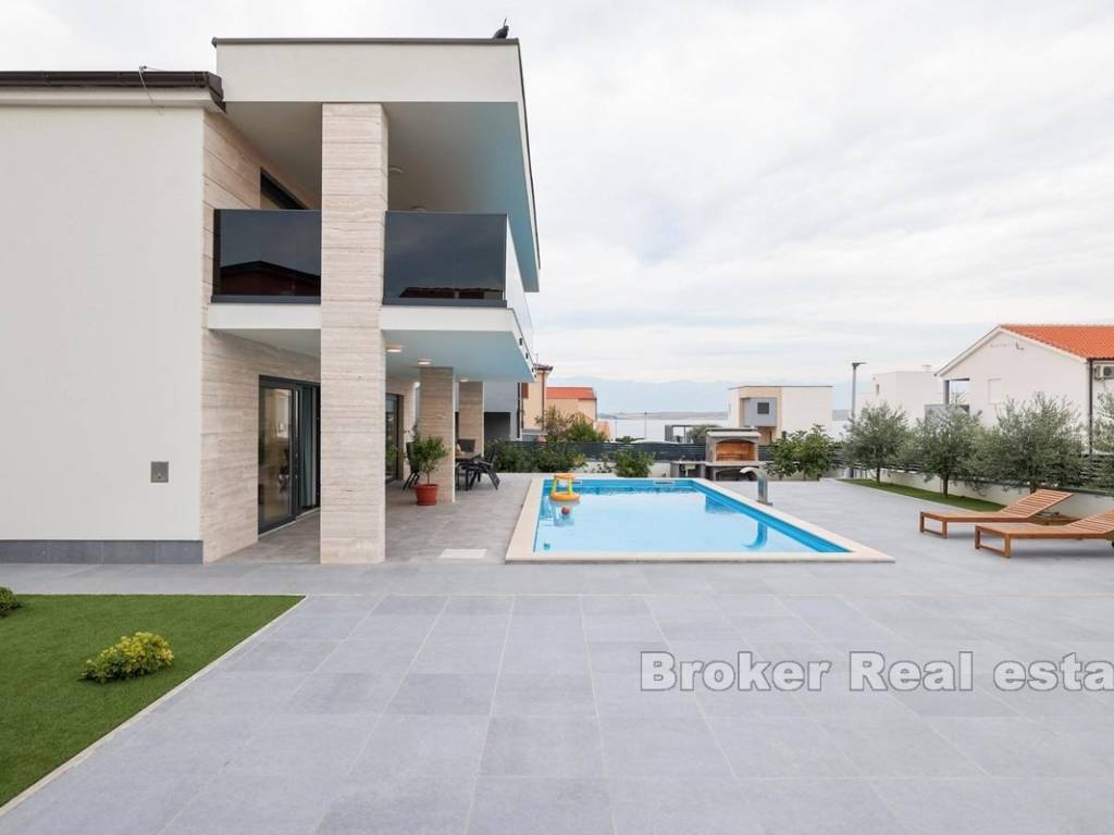 Prekrasna kuća u novogradnji na otoku Viru. Nova samostojeća kuća s modernim dizajnom u uvali na Viru. Kuća stambene površine 220 m2 nalazi se na zemljištu od 553 m2 u manjem mjestu što samim tim pruža mir. Kuća je kompletno odvojena privatnom ogradom što osigurava veliku dozu privatnosti. Okućnica je iznimno velika i bogata te je krase masline i zelenilo te sadržaji poput grijanog bazena od 42 m2, vanjskog tuša i roštilja. Kuća se proteže na dvije etaže. Na prvoj etaži nalaze se kuhinja s blagovaonicom, dnevna soba te spavaća soba i dvije kupaonice. Staklene stijenke se protežu cijelim prostorom prizemlja te svaka stijenka ima mogućnost kompletnog otvaranja što daje osjećaj otvorenog u zatvorenom. Unutarnje stepenice vode do gornje etaže gdje se nalaze četiri spavaće sobe i četiri kupaonice. Sobe imaju izlaz na predivni zajednički balkon koji pruža pogled na more u blizini. Čitava donja etaža je dizajnirana na način da bude potpuno pristupačna osobama s invaliditetom. S obzirom na moderni dizajn, blizinu mora te sami pristup nekretnini, kuća može poslužiti za osobnu upotrebu ili vikendicu te kao izvrstan ulog.