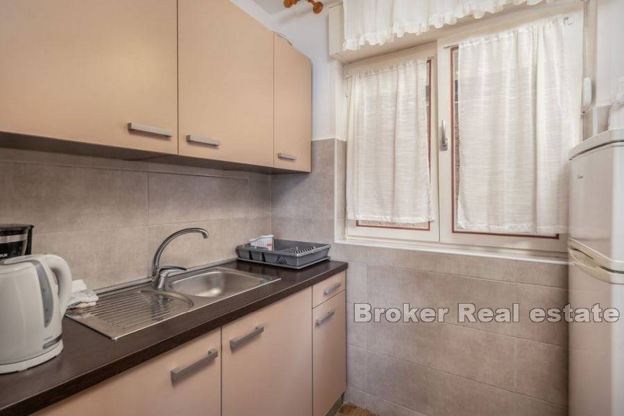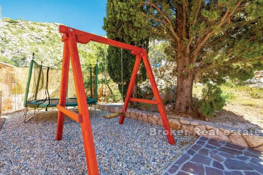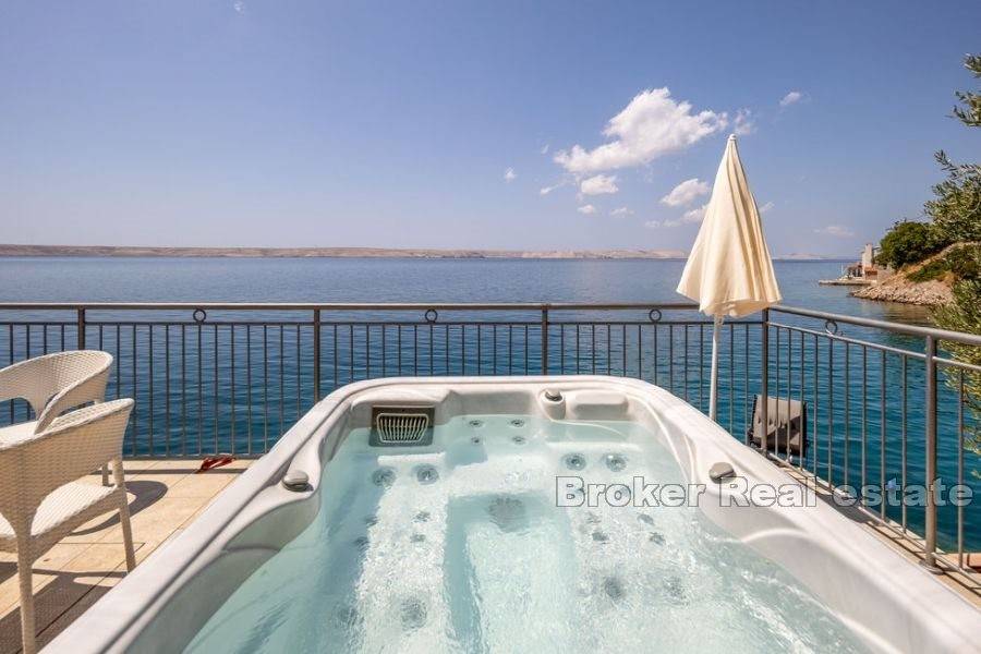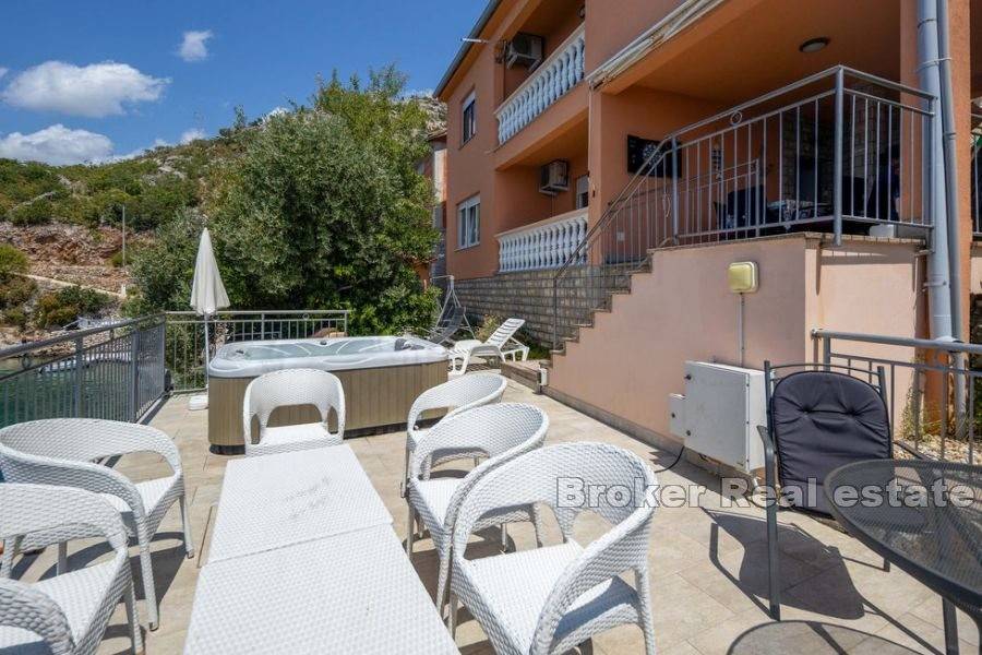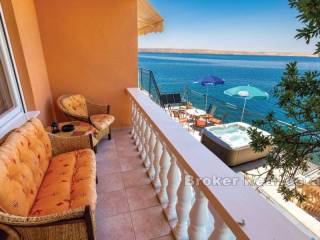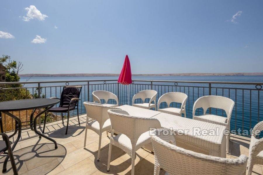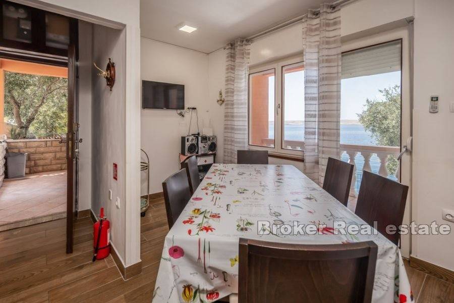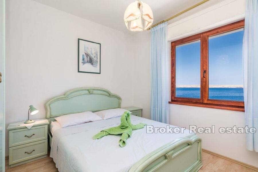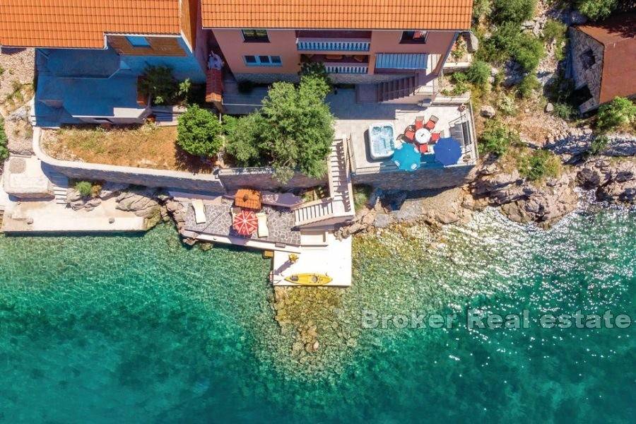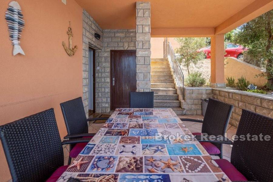 Kuća za odmor smještena na atraktivnoj lokaciji uz more. Izgrađena na parceli od 870 m2 prostire se na dvije etaže koje se sastoje od dva apartmana s ukupno pet spavaćih soba, dvije kupaonice i dvije kuhinje. Održavana i očuvana, prodaje se s namještajem. Za grijanje i hlađenje koristi se klima uređaj. Na okućnici je smještena garaža, parking za nekoliko automobila i kutak uređen za dječju zabavu. Ono što ovu nekretninu čini jedinstvenom je pristup uređenoj betoniranoj plaži i vez za brod. Ova mala oaza idealna je za ljubitelje atrakcija i zabava na moru. Terase s kojih se pruža jedinstven pogled na more osim što proširuju unutarnji prostor čine idiličan ambijent za zajedničko druženje posebno u ljetnom periodu. S obzirom na poziciju uz more nudi izvrsnu priliku za turističko iznajmljivanje te je također idealna za godišnje odmore i bijeg od gradske vreve.