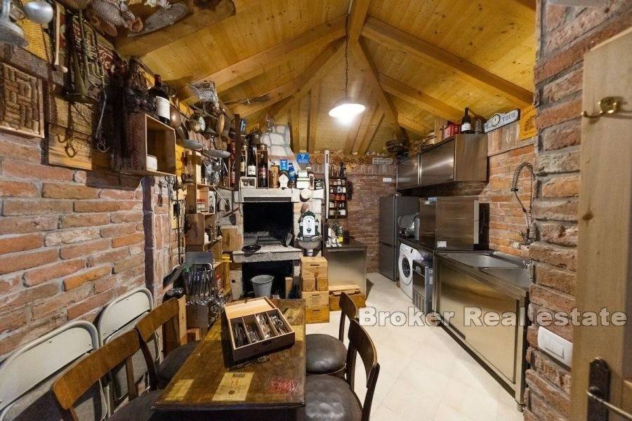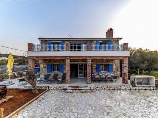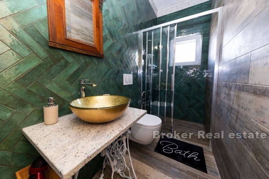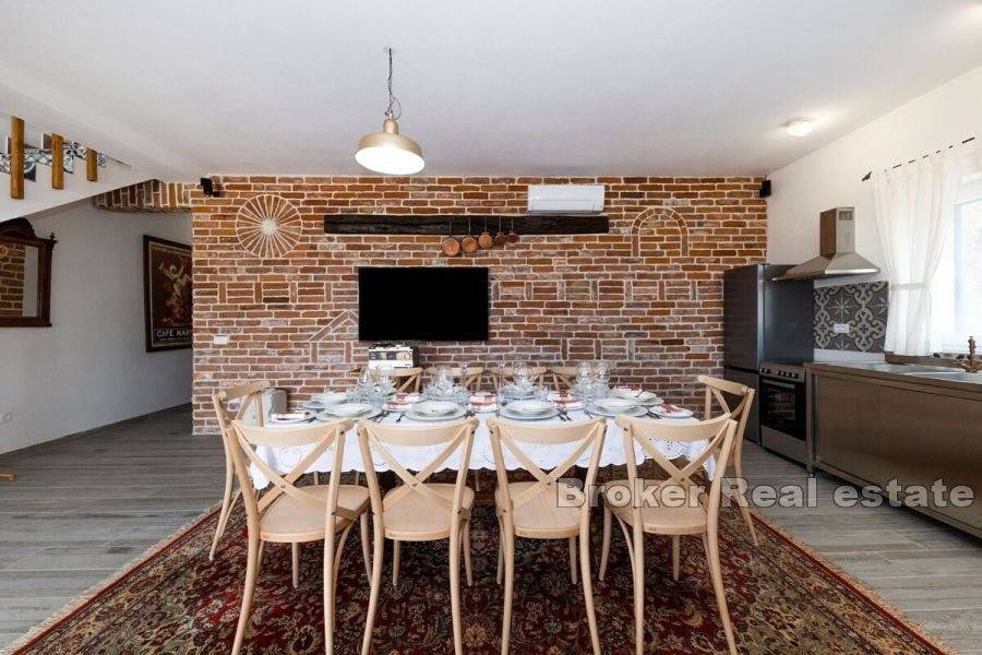 Sjajna bezvremenska kamena kuća smještena u mirnom okruženju pružajući neometan pogled na more. Izgrađena na zemljištu od 493 m2 proteže se na dvije komforne etaže ukupne stambene površine 285 m2. Sastoji se od opremljene kuhinje i blagovaonice, dnevnog boravka, pet spavaćih soba, pet kupaonica i fitness prostorije. Na uređenoj, popločanoj okućnici smješten je neizostavni bazen sa sunčalištem i pomoćni objekt u kojemu se nalazi ljetna kuhinja i kamin. Kuća je u potpunosti namještena i obogaćena živopisnim, razigranim elementima te se kao takva i prodaje. Idiličan ambijent za druženje posebno u ljetnom periodu nudi natkrivena terasa opremljena blagovaonskim stolom i stolicama. Za grijanje i hlađenje se koristi ukupno osam klima uređaja. Nekretnina je spojena na gradski vodovod dok umjesto kanalizacije ima trokomornu septičku jamu. Osim što je idealna za godišnje odmore i obiteljsko življenje ova dalmatinska oaza satkana od starih rustikalnih predmeta nudi izvrsnu priliku za turističko iznajmljivanje. Atraktivno mjesto krase prekrasne plaže te nudi bezbroj mogućnosti za različite aktivnosti.