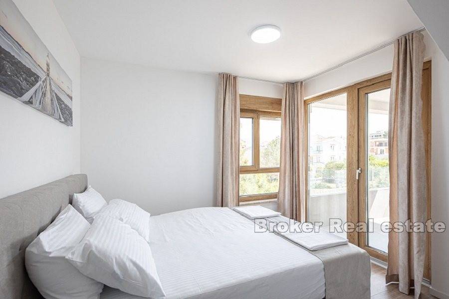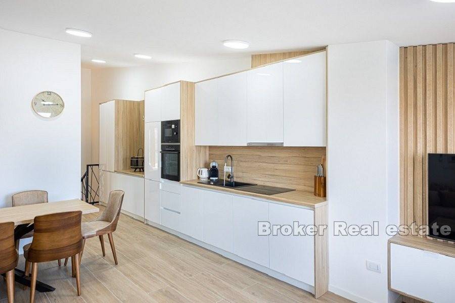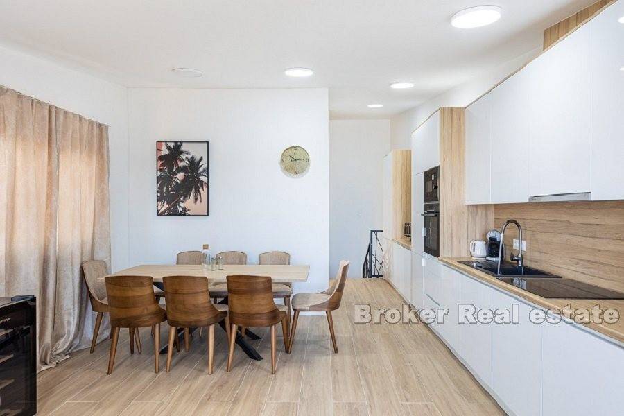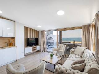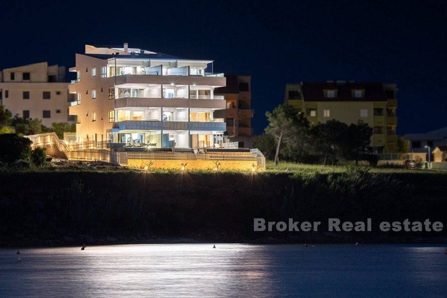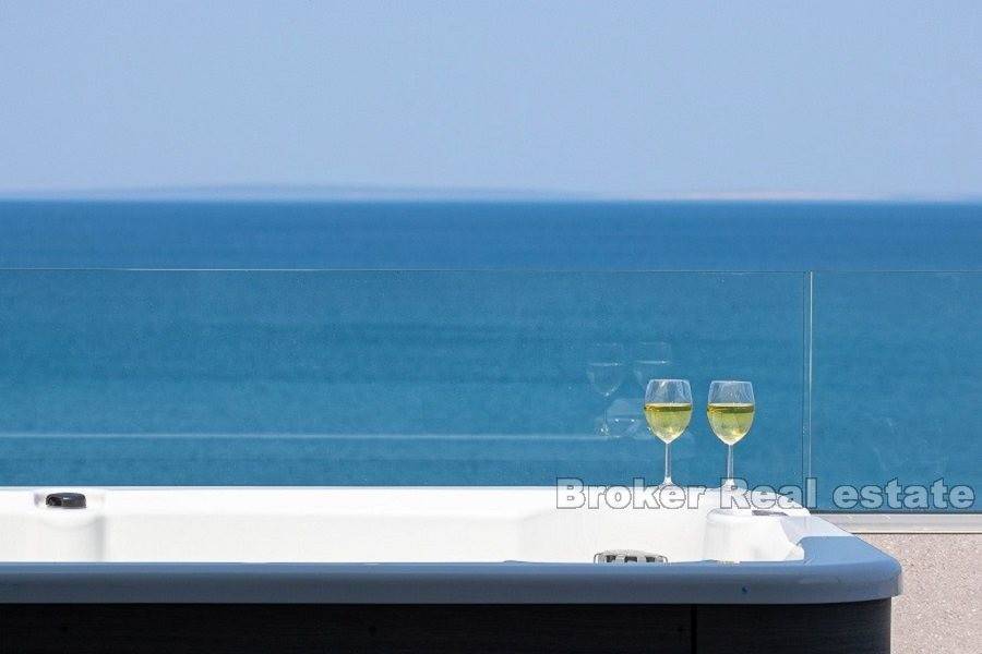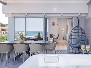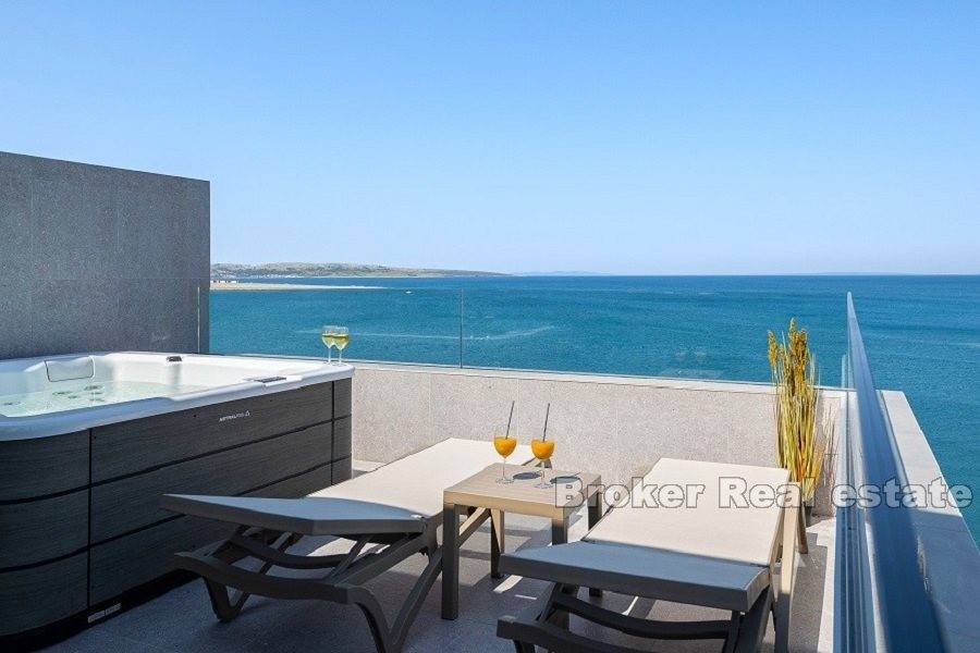 Luksuzni dvoetažni apartman prvi red do mora. Apartman se nalazi na 2. i 3. katu novoizgrađene zgrade. Na prvoj etaži nalaze se tri spavaće sobe, dvije kupaonice i dva balkona, gdje možete uživati u svježem morskom zraku i predivnom pogledu na more. Na drugoj etaži nalazi se galerija, koje je pretvorena u veliki dnevni boravak otvorenog koncepta s izlazom na terasu s jacuzzijem gdje se možete opustiti u pogledu na morsko plavetnilo i fantastične zalaske sunca. Apartman je u cijelosti opremljen i namješten. Odiše elegancijom i kvalitetom. U gradnji su korišteni najkvalitetniji materijali. Ima podno grijanje i klima uređaj povezan na hidroboks ( grijanje, PTV i klima na istom sustavu dizalice topline-Samsung) Odlična nekretnina uz more i plažu. Parking mjesto uključeno u cijenu. Apartman je u sustavu PDV-a, kupac ne plača porez na promet nekretnina.