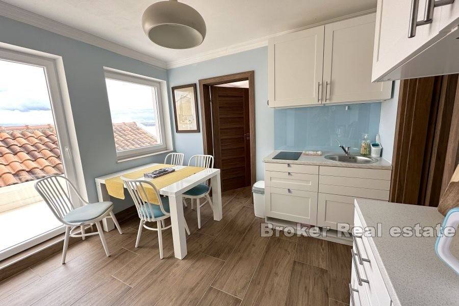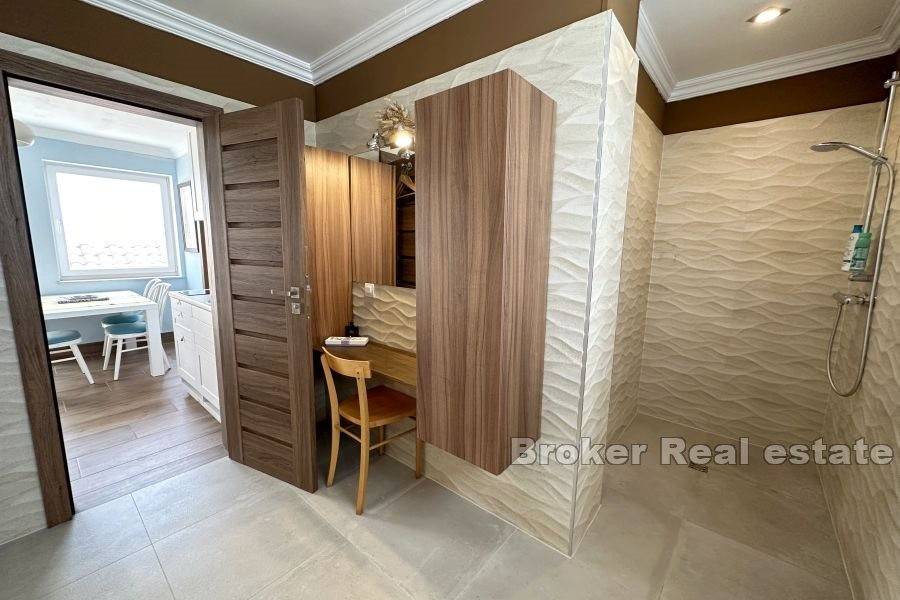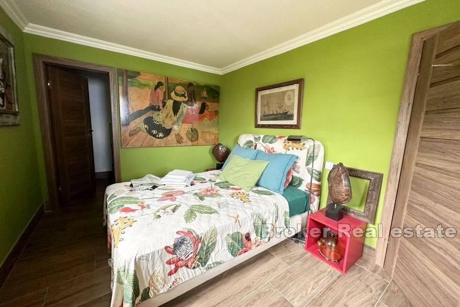 Apartman na gornjoj etaži ima cca 60 kvadrata te se sastoji od dvije spavaće sobe, kupaonice i kuhinje. Gotovo svaka prostorija u kući ima izlaz na vlastiti balkon ili terasu.