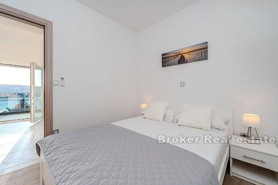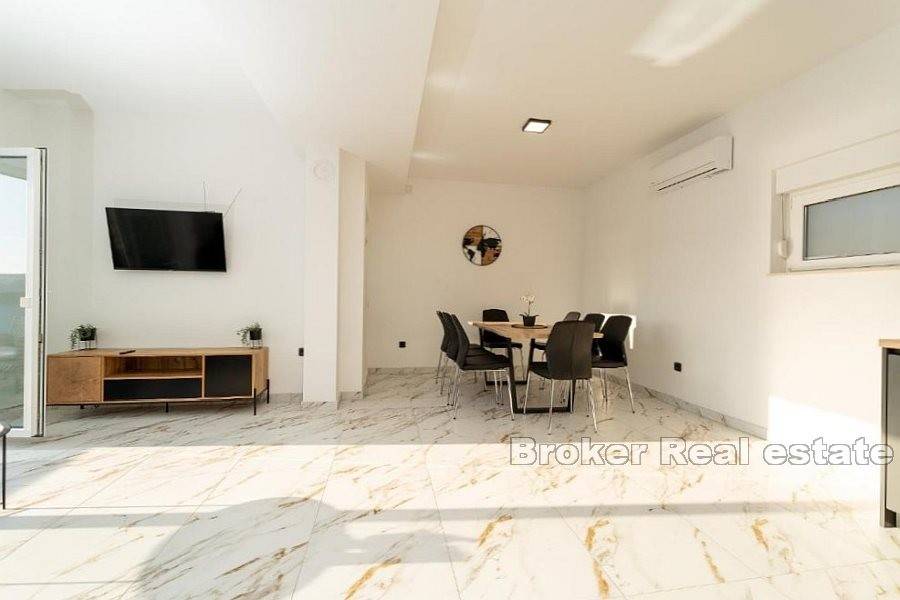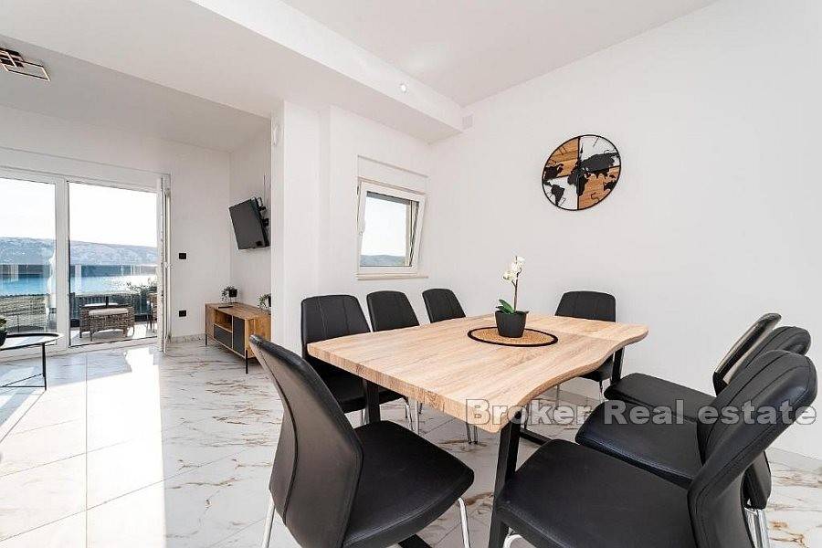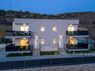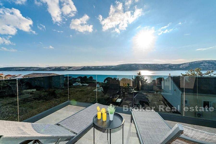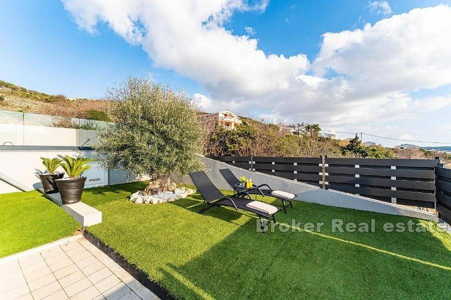 Apartman se sastoji od hodnika, dvije kupaonice od kojih jedna ima tuš kabinu a druga kadu, četiri spavaće sobe, kuhinje s blagovaonicom i dnevnog boravka s izlazom na terasu koja nudi pogled na more. Za grijanje i hlađenje se koristi klima uređaji koji se nalazi u svim prostorijama osim u kupaonicama. Podno grijanje je postavljeno u svim kupaonicama kao i u dnevnim boravcima. Na uređenoj i popločanoj okućnici je smješten bazen i parking za nekoliko automobila. Osim što je idealna za godišnje odmore uz more ova nekretnina pruža mogućnost kombinacije iznajmljivanja i življenja.