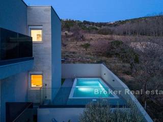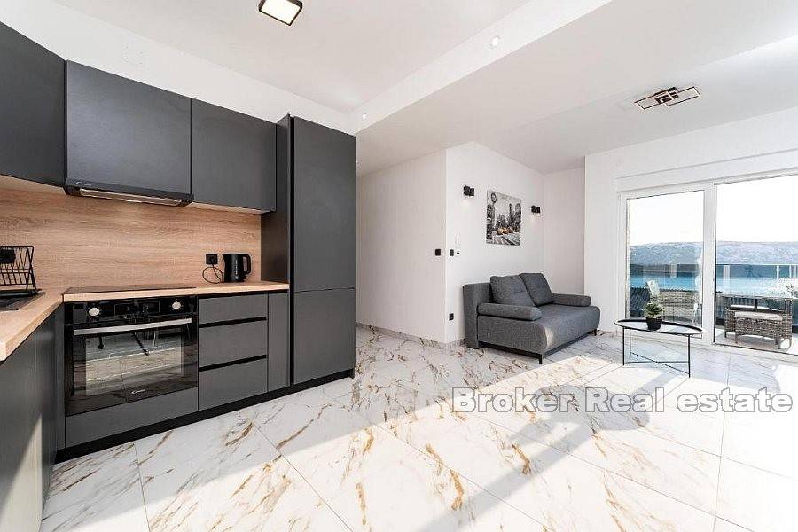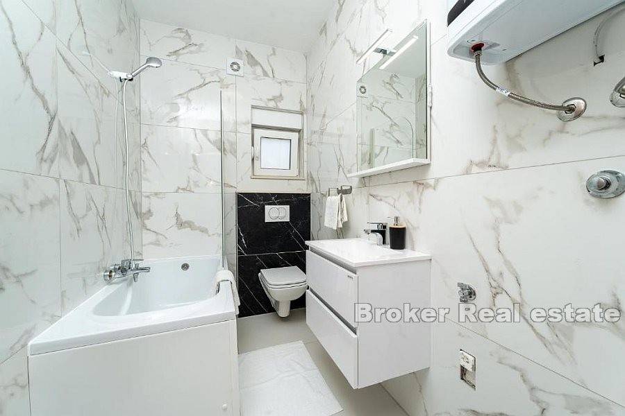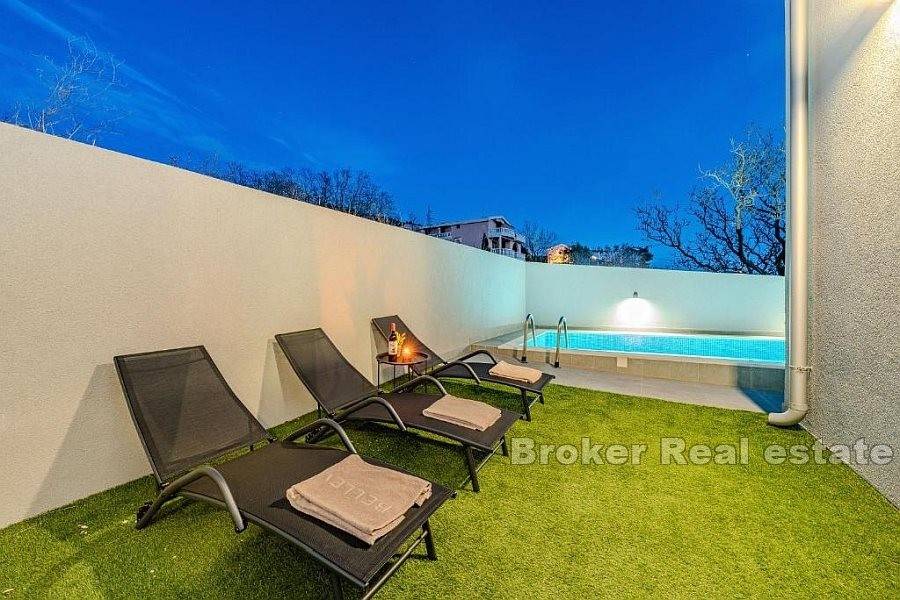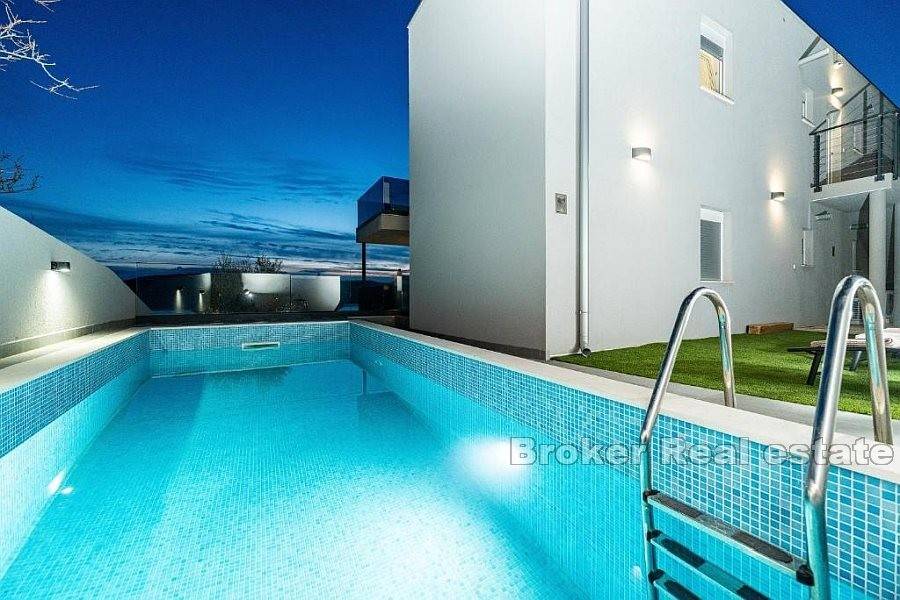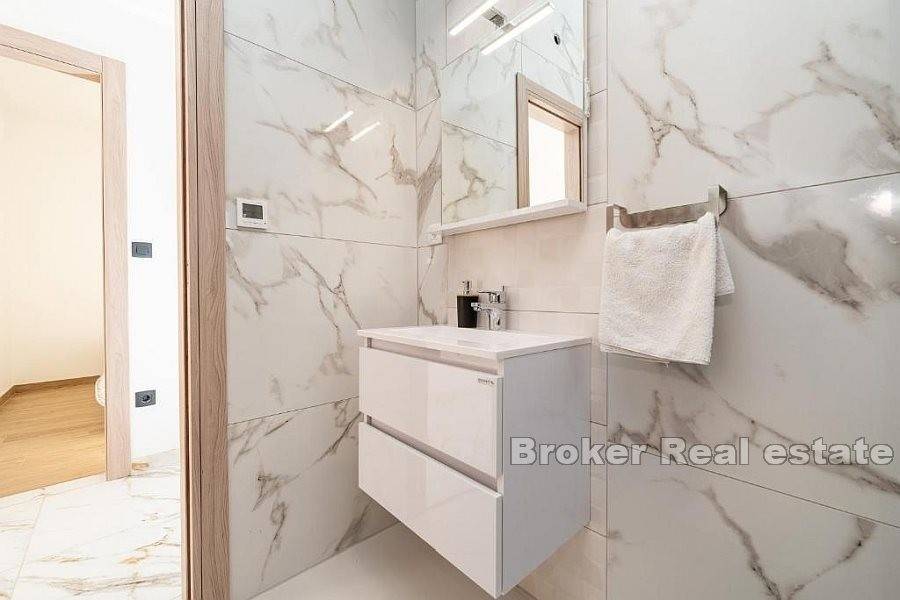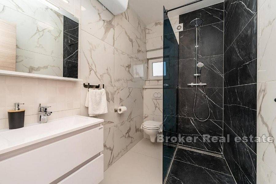 Apartman se sastoji od hodnika, dvije kupaonice od kojih jedna ima tuš kabinu a druga kadu, četiri spavaće sobe, kuhinje s blagovaonicom i dnevnog boravka s izlazom na terasu koja nudi pogled na more. Za grijanje i hlađenje se koristi klima uređaji koji se nalazi u svim prostorijama osim u kupaonicama. Podno grijanje je postavljeno u svim kupaonicama kao i u dnevnim boravcima. Na uređenoj i popločanoj okućnici je smješten bazen i parking za nekoliko automobila. Osim što je idealna za godišnje odmore uz more ova nekretnina pruža mogućnost kombinacije iznajmljivanja i življenja.
