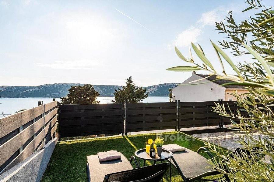 Na prodaju, objekt s tri apartmana, izgrađen na parceli od 518 m2 nedaleko od mora i plaže. Smješten u mirnom i uređenom okruženju u jednom od najpoželjnijih priobalnih mjesta. Prostire se na dvije etaže ukupne unutarnje stambene površine 200 m2 te dodatne četiri terase od kojih svaka ima 11 m2. Na prizemlju se nalaze dva apartmana po 50 m2 dok se na prvoj etaži nalazi apartman od 100 m2. Apartmani u prizemlju se sastoje od dvije spavaće sobe, kupaonice i prostorije u kojoj je smještena kuhinja, blagovaonica i dnevni boravak s izlazom na terase s kojih se pruža pogled na more. Ulaz u apartmane se nalazi s prednje strane nekretnine.