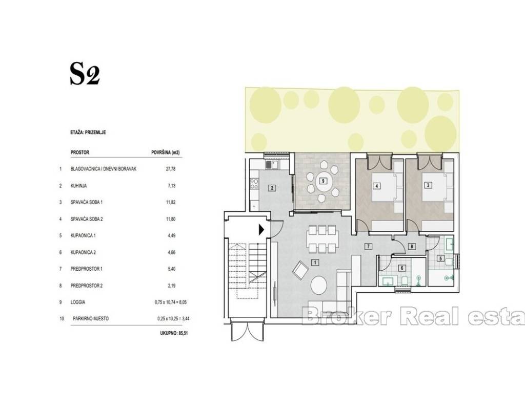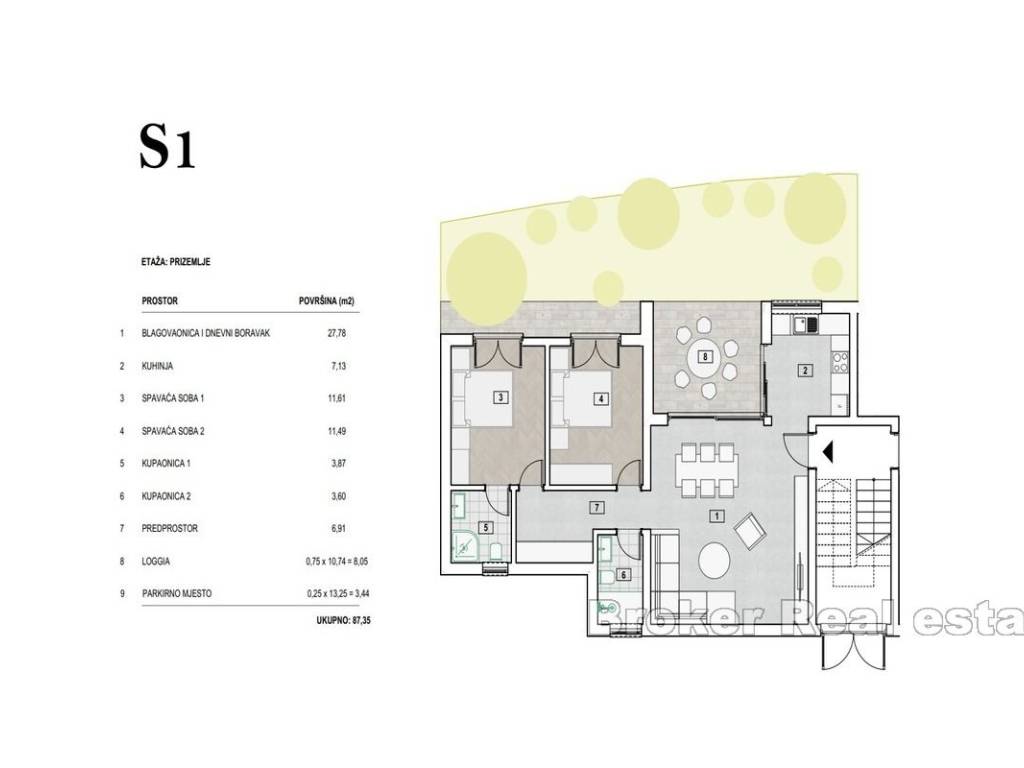 -Apartman S1, Prizemlje s vrtom- 87m2 Sastoji se od dnevnog boravka s blagovaonicom, kuhinje, 2 sobe, 2 kupatila, hodnika, lođe, vrta i parking mjesta